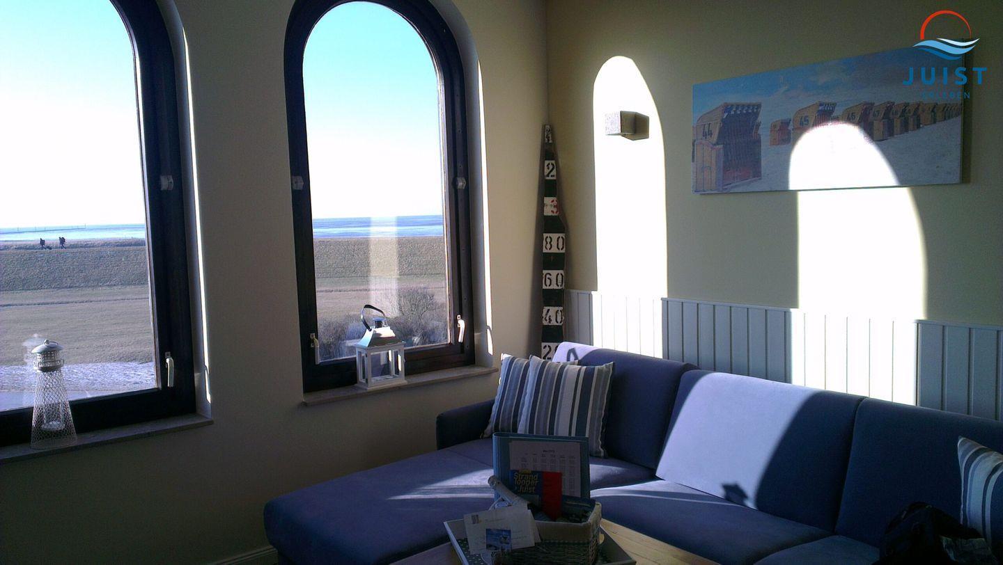 Vom Wohnzimmer aus genießen Sie einen traumhaften Blick über den Deich auf die Salzwiesen.