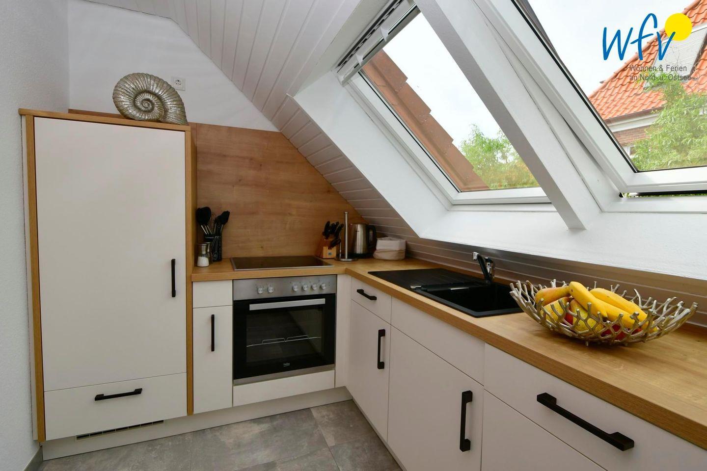 Für eine bequeme Selbstverpflegung ist die Küche u.a. mit einem Herd mit Backofen, Kühlschrank und Geschirrspüler sowie Kaffeemaschine und Toaster ausgestattet.