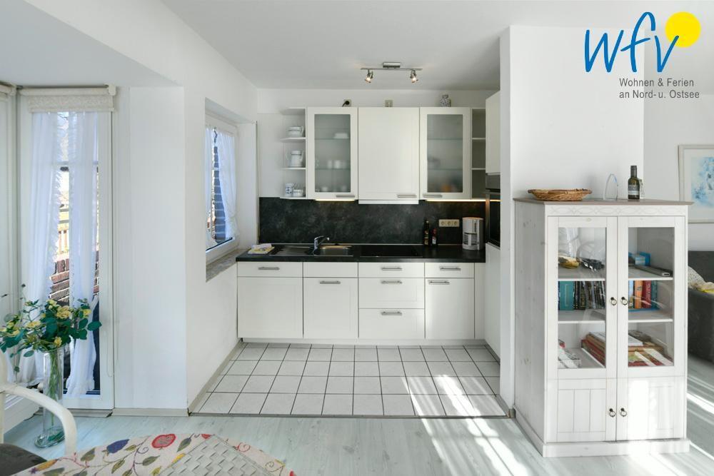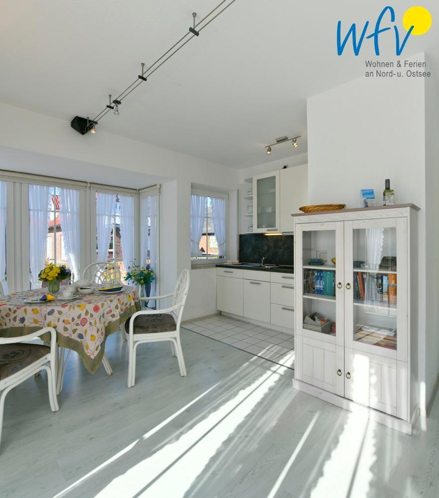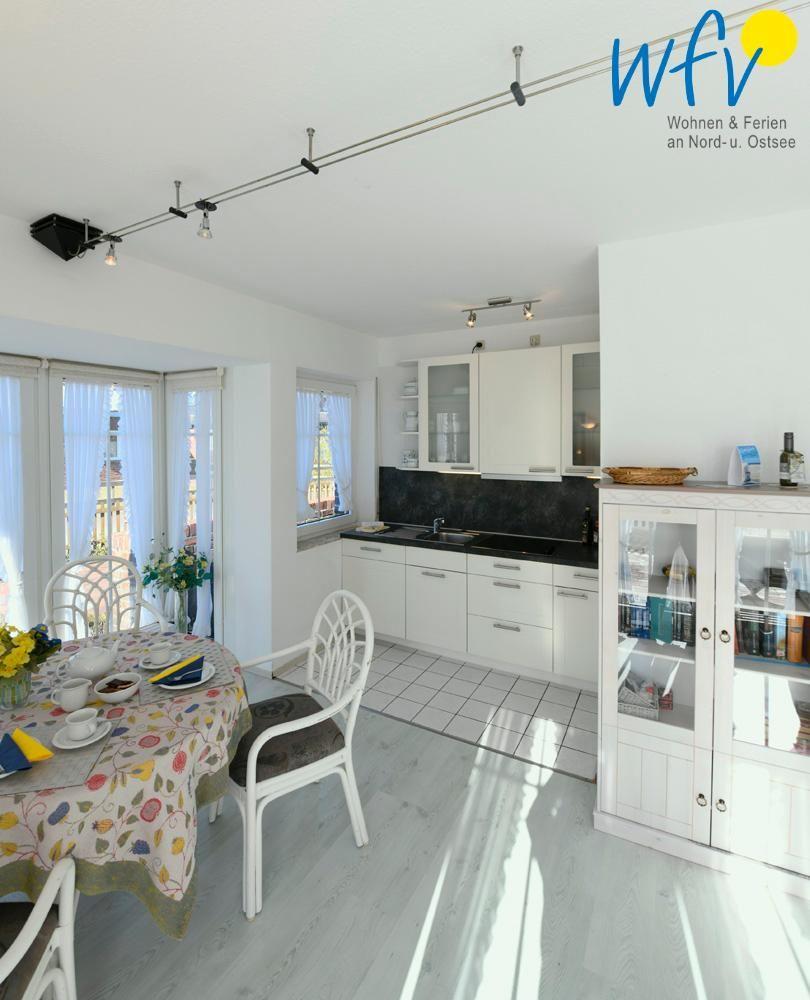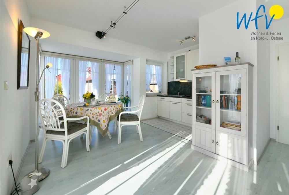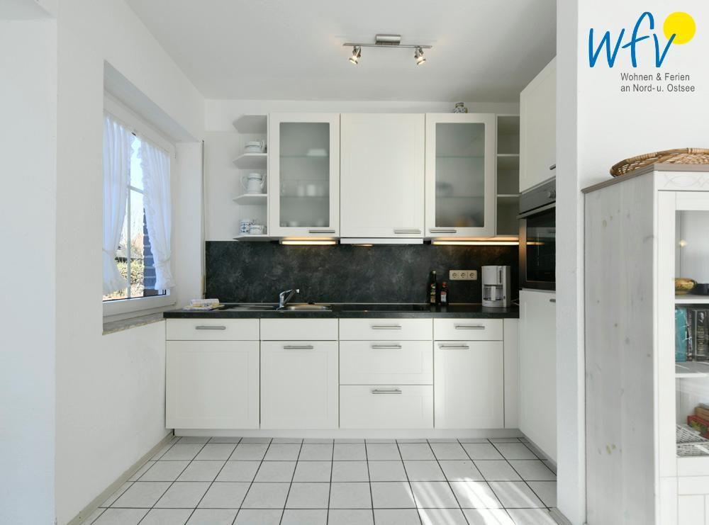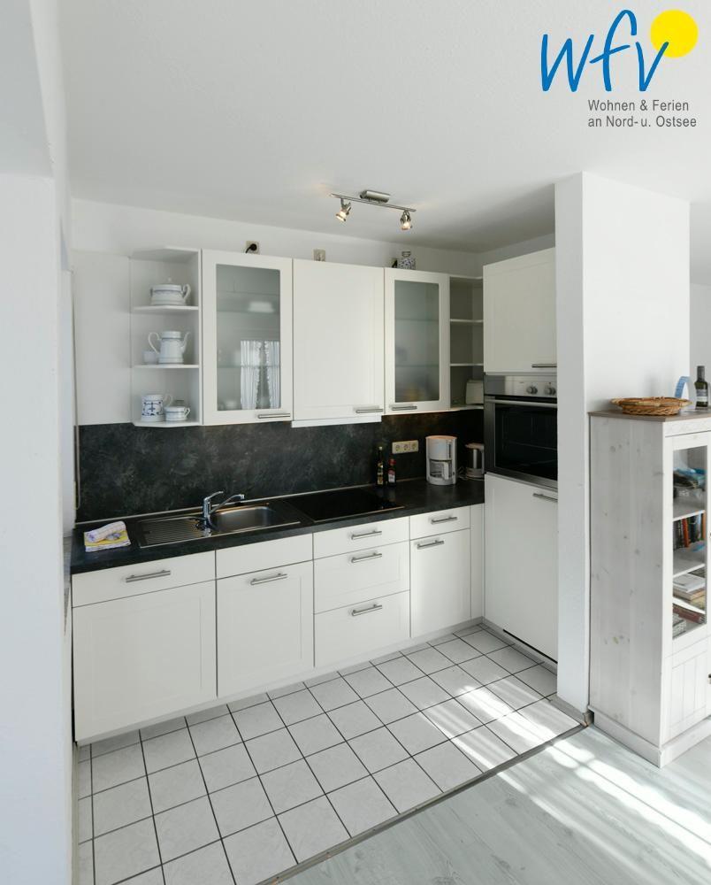 Die Küchenzeile ist optisch vom Wohnraum abgeteilt und u.a. mit einem 4-Platten-Ceran-Herd, einem Backofen und einer Spülmaschine ausgestattet. Ein Esstisch lädt zu gemeinsamen Mahlzeiten ein.