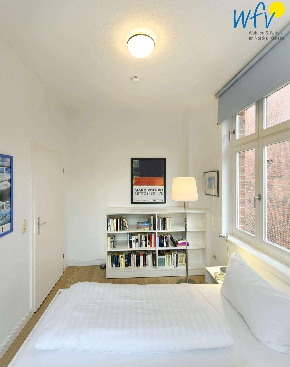 Die zwei separaten Schlafzimmer der Ferienwohnung „Robbenplate“ auf Juist teilen sich in Eltern – und Kinderschlafzimmer auf. Eines der Zimmer ist mit einem Doppelbett eingerichtet, das andere mit zwei Einzelbetten (eines davon zum Doppelbett ausziehbar).