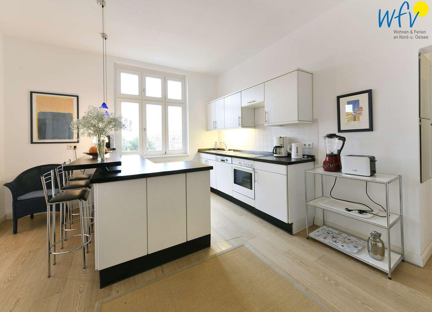 Es empfängt Sie eine modern eingerichtete Wohnküche: Sowohl der Tresentisch, als auch der Essbereich im Turmerker bietet Gelegenheit zum Sitzen. Eine komplette Ausstattung (4-Platten-Ceranfeld, Backofen, Spülmaschine) ermöglicht Ihnen eine bequeme Selbstverpflegung.