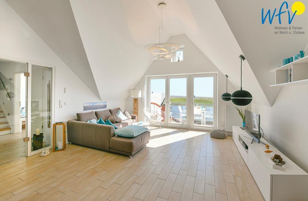 Aus dem Panoramafenster im Spitzboden schauen Sie direkt auf Juists herrliche Dünenlandschaft und zum Hafen.