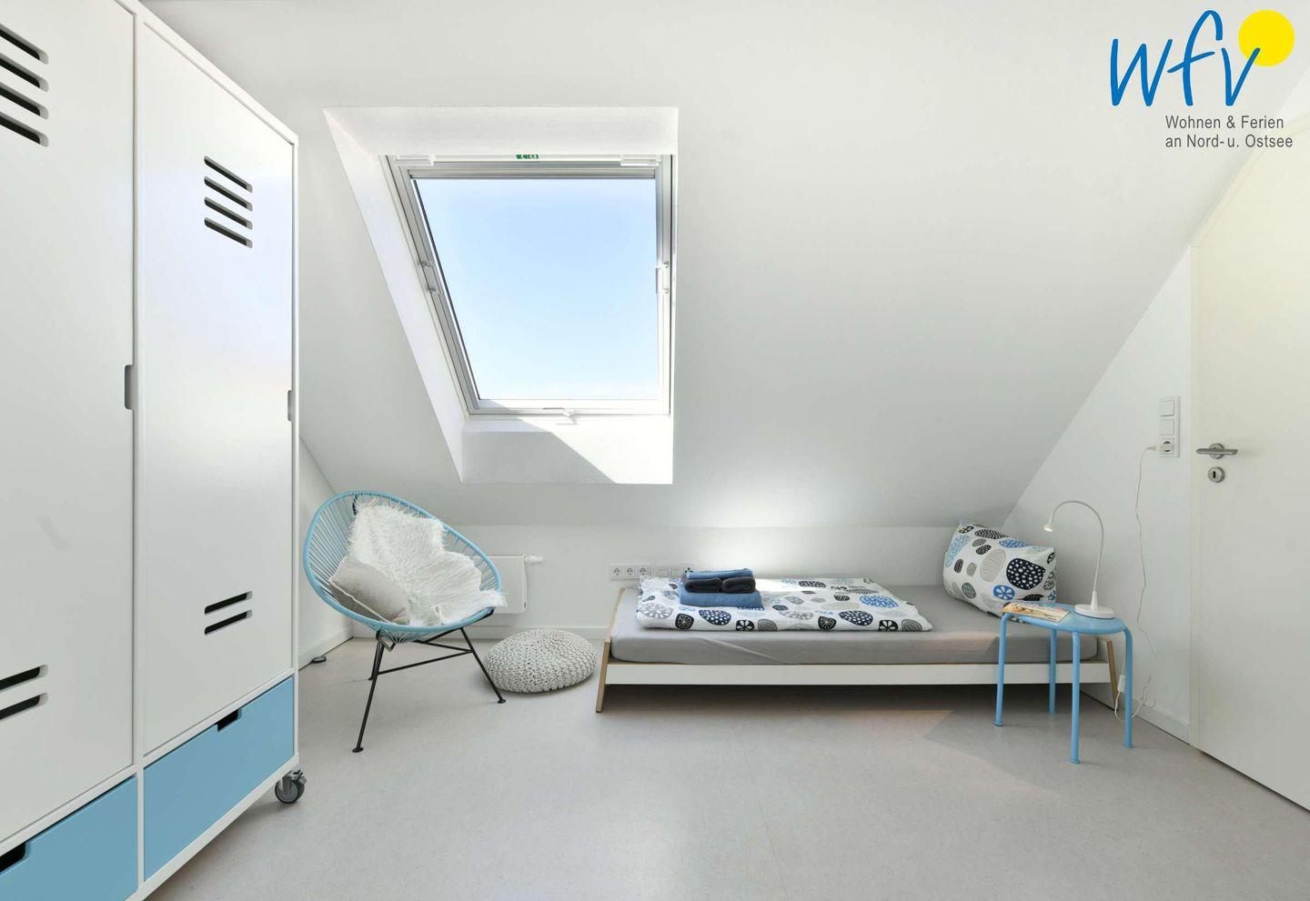 Das separate Elternschlafzimmer in der ersten Etage ist mit einem Doppelbett und einem begehbaren Kleiderschrank ausgestattet. In dem separaten Schlafraum im Dachgeschoss befinden sich vier Stapelbetten, die Sie auch ganz leicht zu Doppelbetten zusammenstellen können, sowie ein mobiler Kleiderschrank.