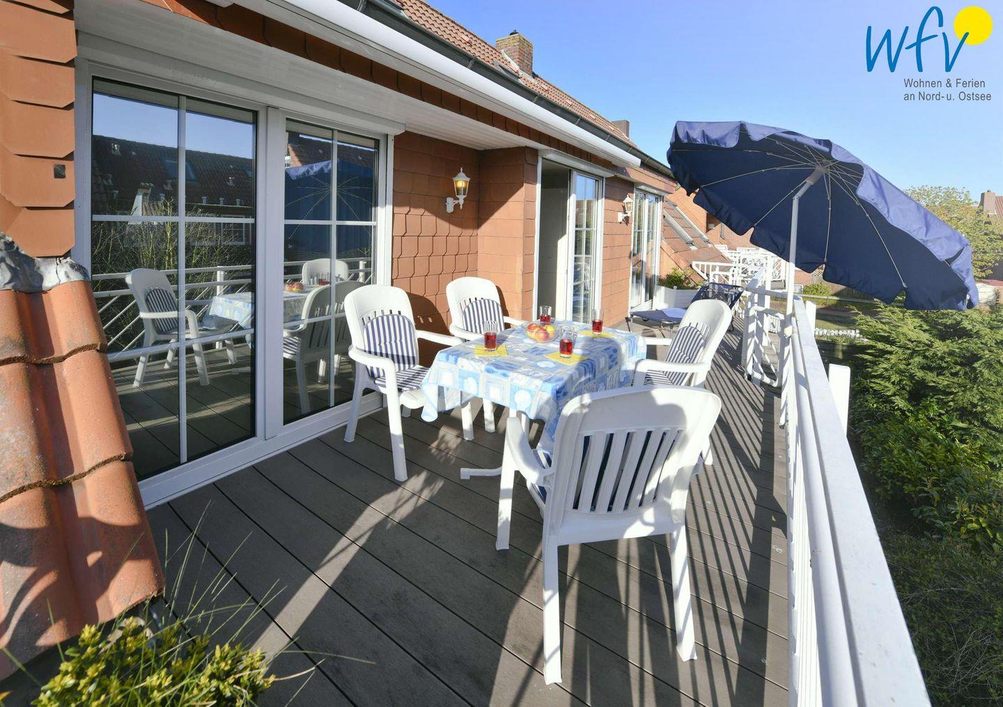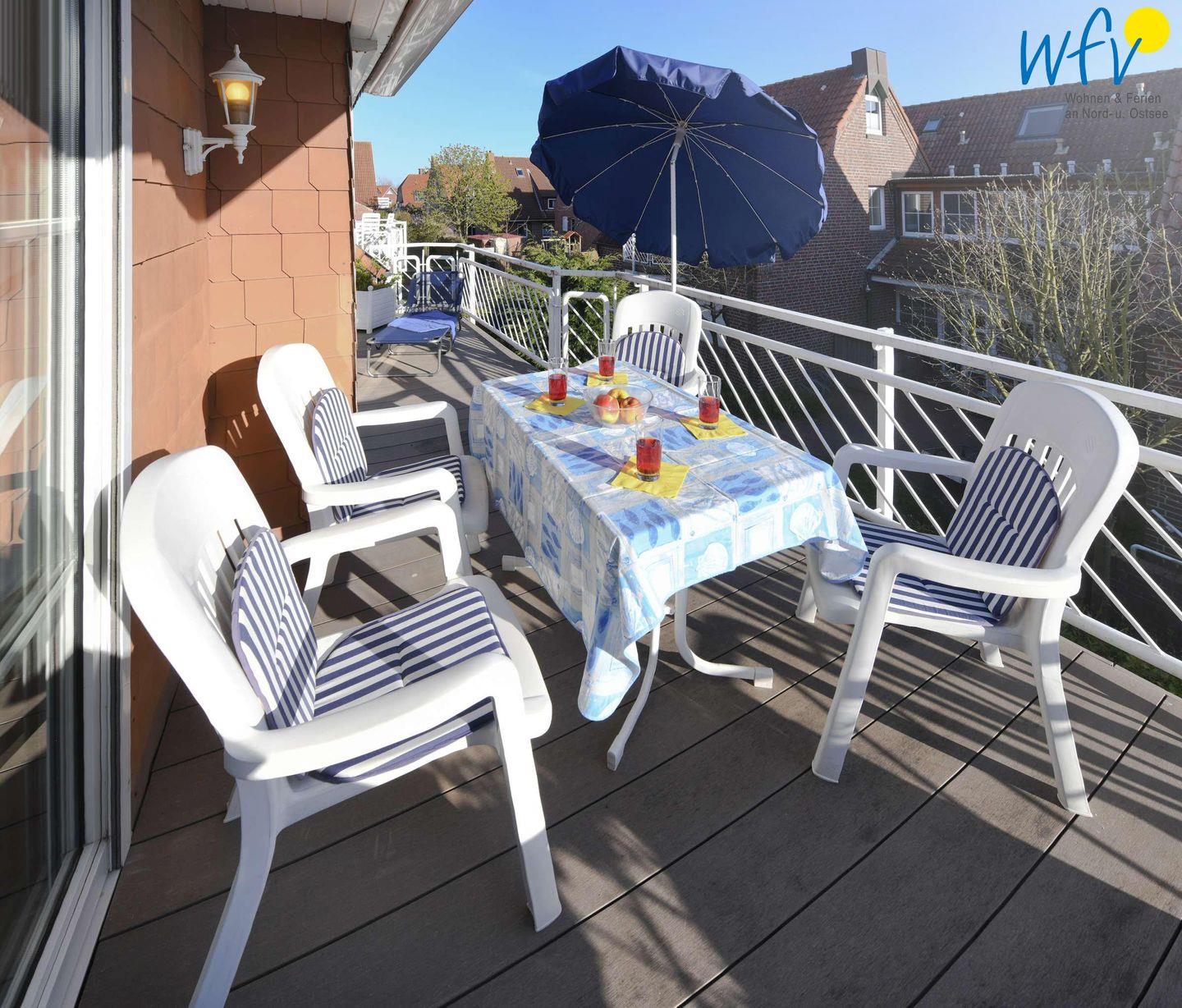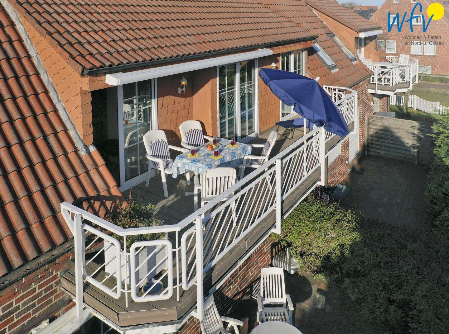 Genießen Sie auf dem schönen Südbalkon herrliche Sonnenbäder inklusive frischer Nordseeluft! Traumhafte Entspannungsmomente sind Ihnen hier garantiert. Auf den Balkon der Wohnung gelangen Sie sowohl vom Wohnraum, als auch von den beiden unteren Schlafzimmern aus.