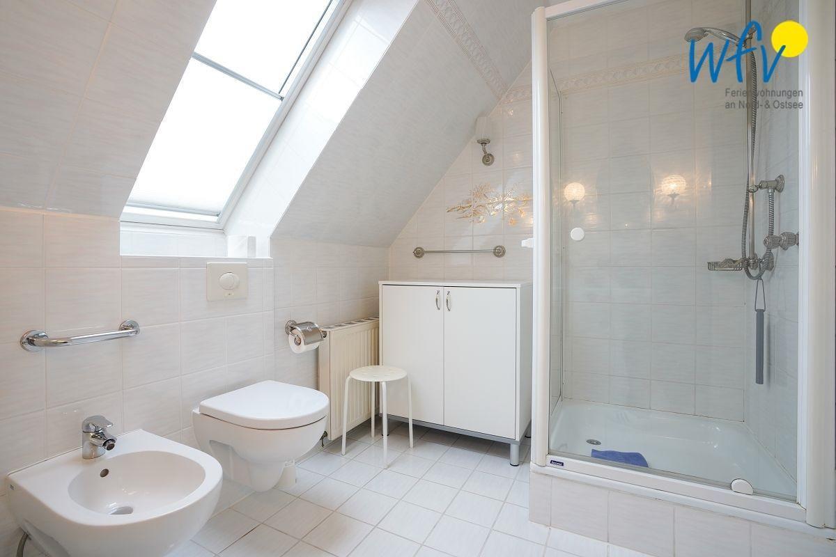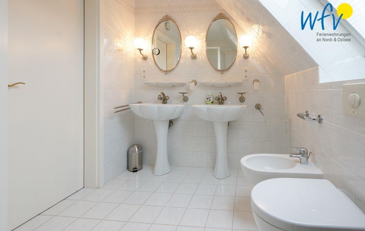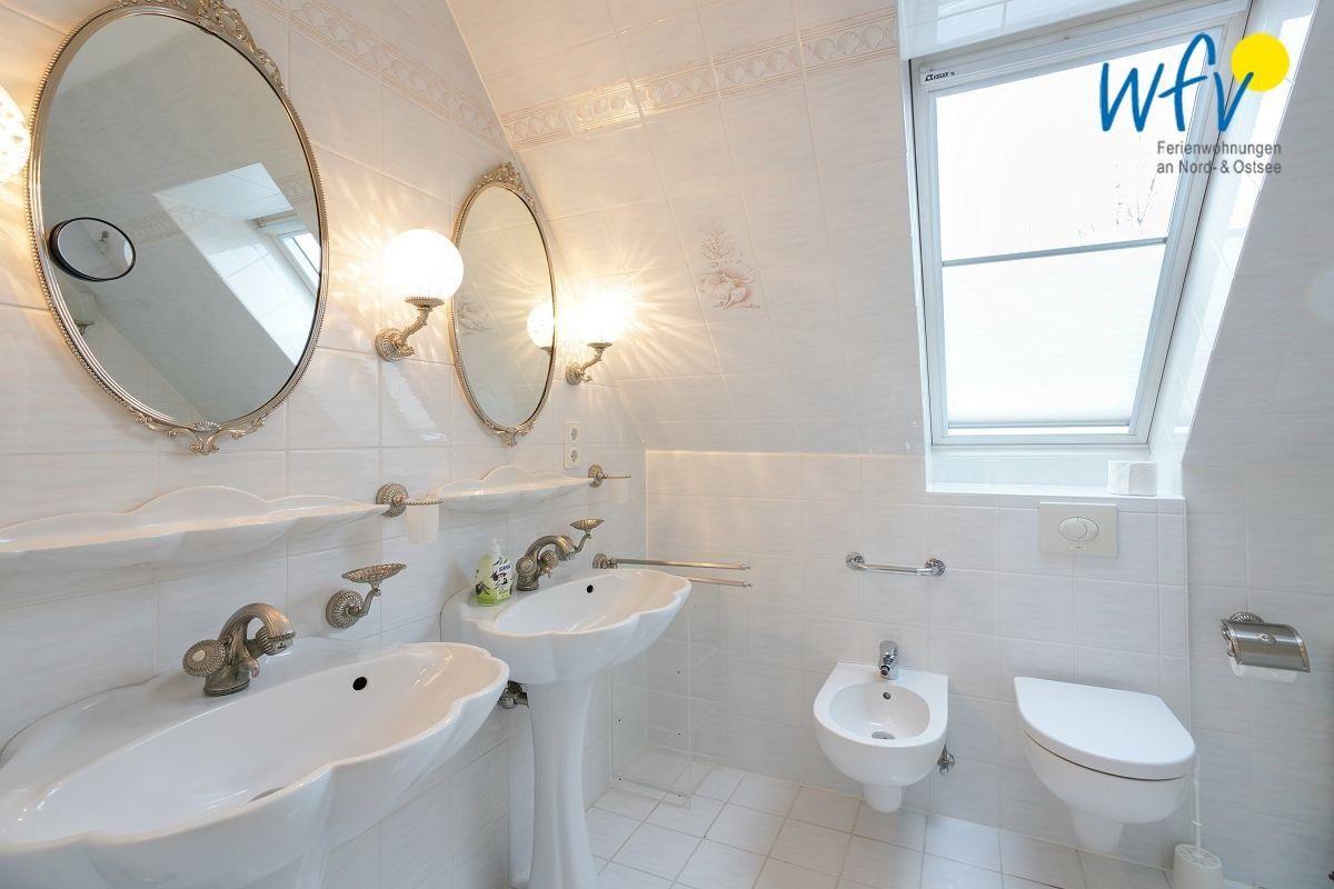 Die Ferienwohnung verfügt über zwei große Tageslichtbäder. Eines mit zwei Waschbecken, Bidet, WC und Dusche; das andere mit Waschbecken, WC und Dusche. Waschmaschine und Trockner stehen Ihnen in einem zur Wohnung gehörenden Keller zur Verfügung.