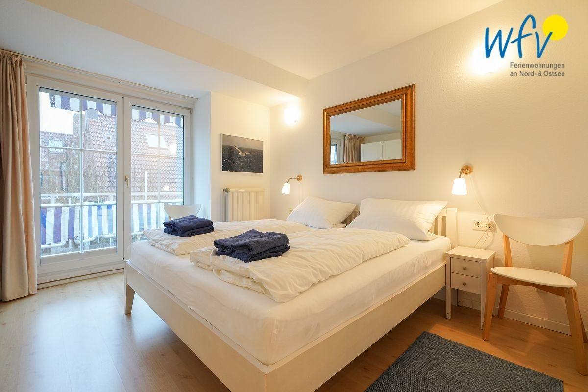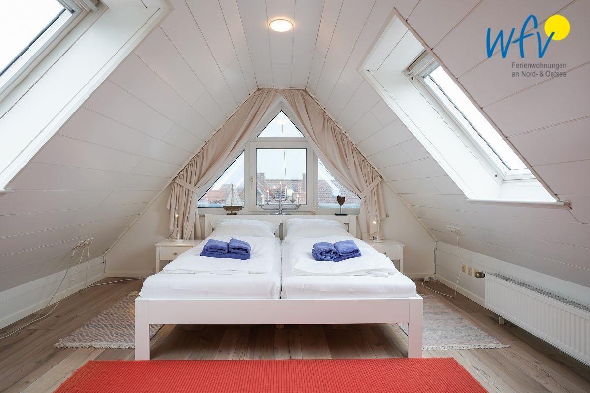 Drei separate Schlafzimmer bieten in der Ferienwohnung "Caprasse" auf Juist auch bei einem Aufenthalt zu mehreren Personen angenehme Rückzugsmöglichkeiten. Die beiden Schlafzimmer in der unteren Etage sind mit jeweils einem Doppelbett ausgestattet. Im Dachgeschoss befindet sich ein gemütliches helles Studio mit einem Doppelbett für zwei weitere Personen.