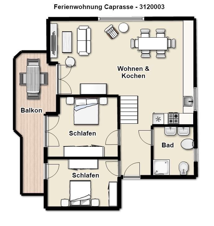 Unsere großzügige Ferienwohnung „Caprasse“ mit drei separaten Schlafzimmern und wunderbarem Südbalkon bietet Ihnen Platz für bis zu sechs Personen.