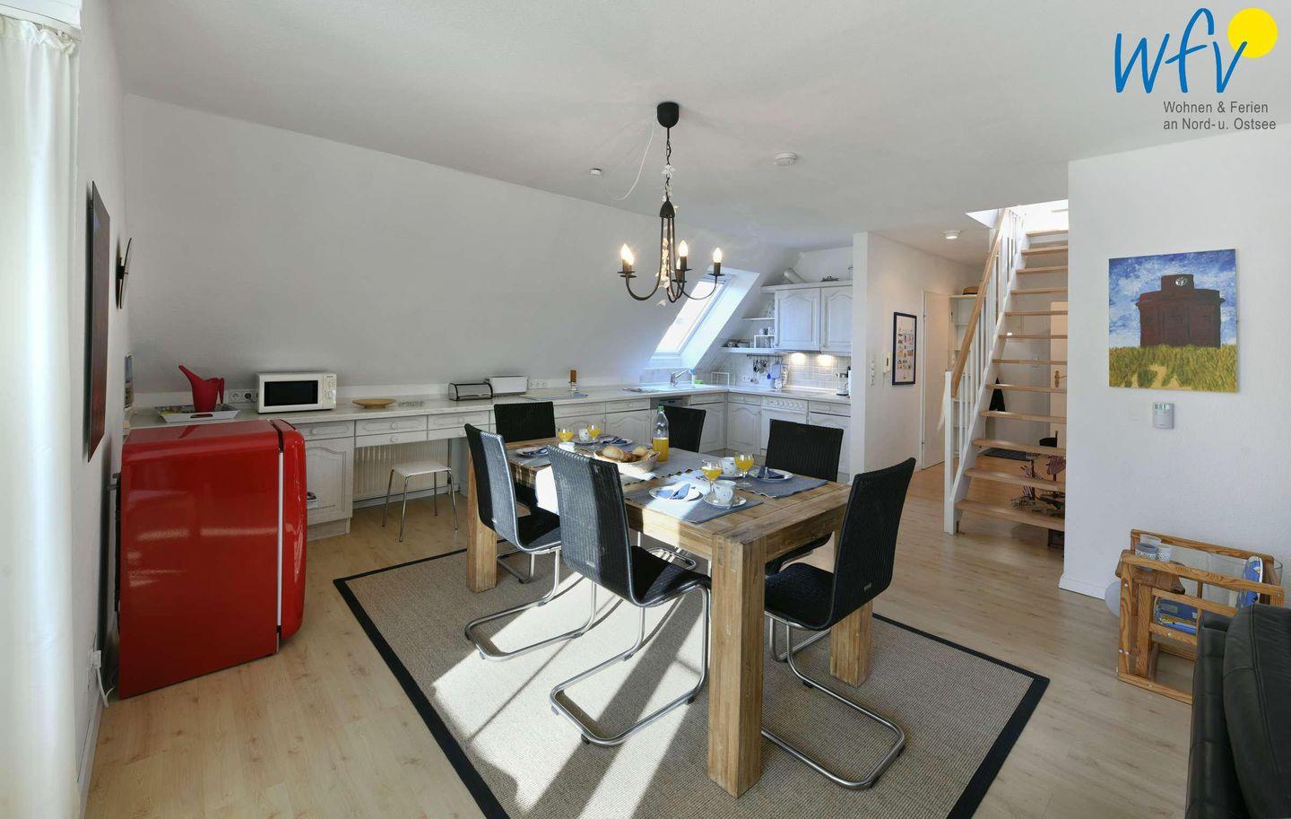Die komfortable Ferienwohnung erstreckt sich über zwei Etagen und verfügt über einen Wohnraum mit integrierter Wohnküche, drei separate Schlafzimmer, zwei Bäder und einen Balkon. Helle Räume, modernes Mobiliar und eine liebevolle Einrichtung machen die Ferienwohnung zu einer Wohlfühloase, in der Sie Ihren Urlaub auf Juist in vollen Zügen genießen können.