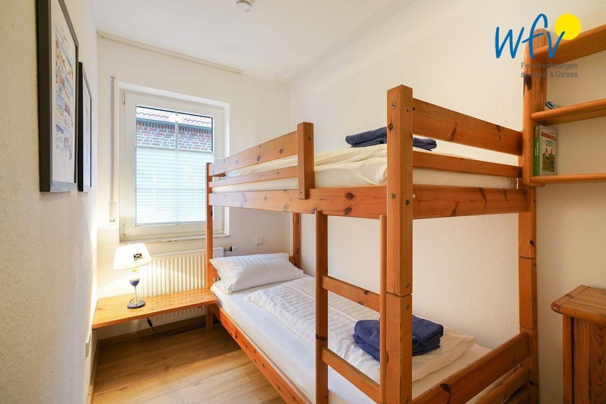 In dem Elternschlafzimmer der Juister Ferienwohnung befindet sich ein Doppelbett, in dem Kinderschlafzimmer ein Etagenbett.
