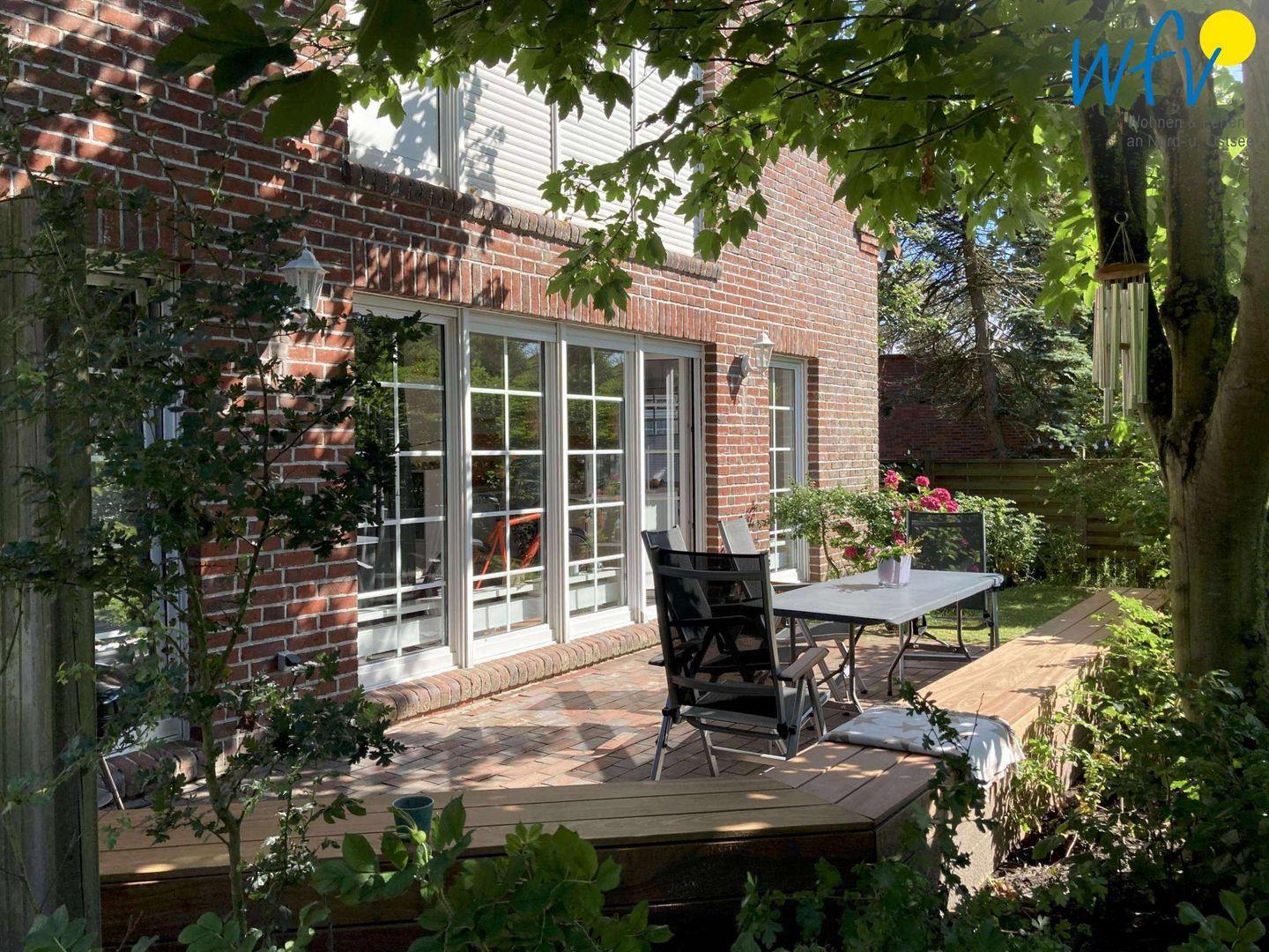 Vom Wohnraum aus gelangen Sie auf die Terrasse, welche blickgeschützt im Garten mit Ausrichtung nach Südwesten liegt. Hier laden Gartenmöbel zum gemütlichen Verweilen ein.