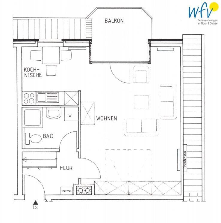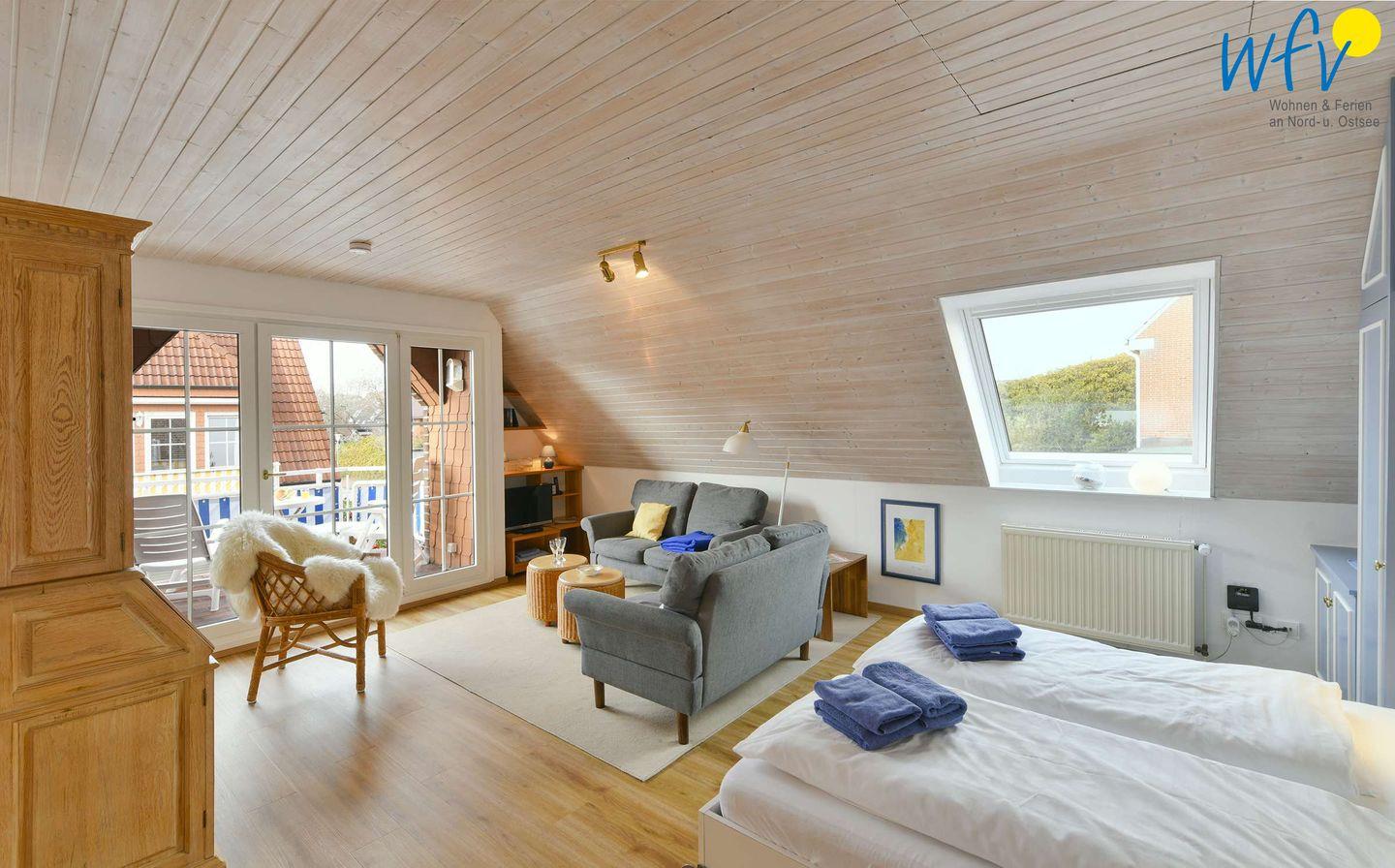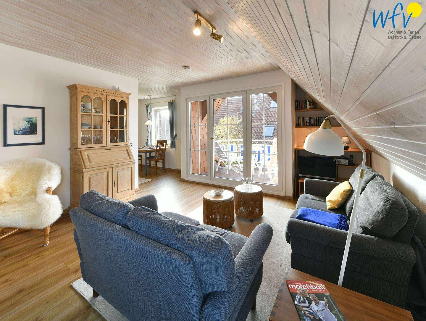 Es erwartet Sie eine optimale Raumaufteilung mit Wohn-/Schlafraum, offener Küche, Duschbad und Balkon. Eine liebevolle Einrichtung im Landhausstil, holzverkleidete Dachschrägen und große Fenster verleihen der Ferienwohnung "Fries" eine sehr gemütliche und freundliche Atmosphäre.