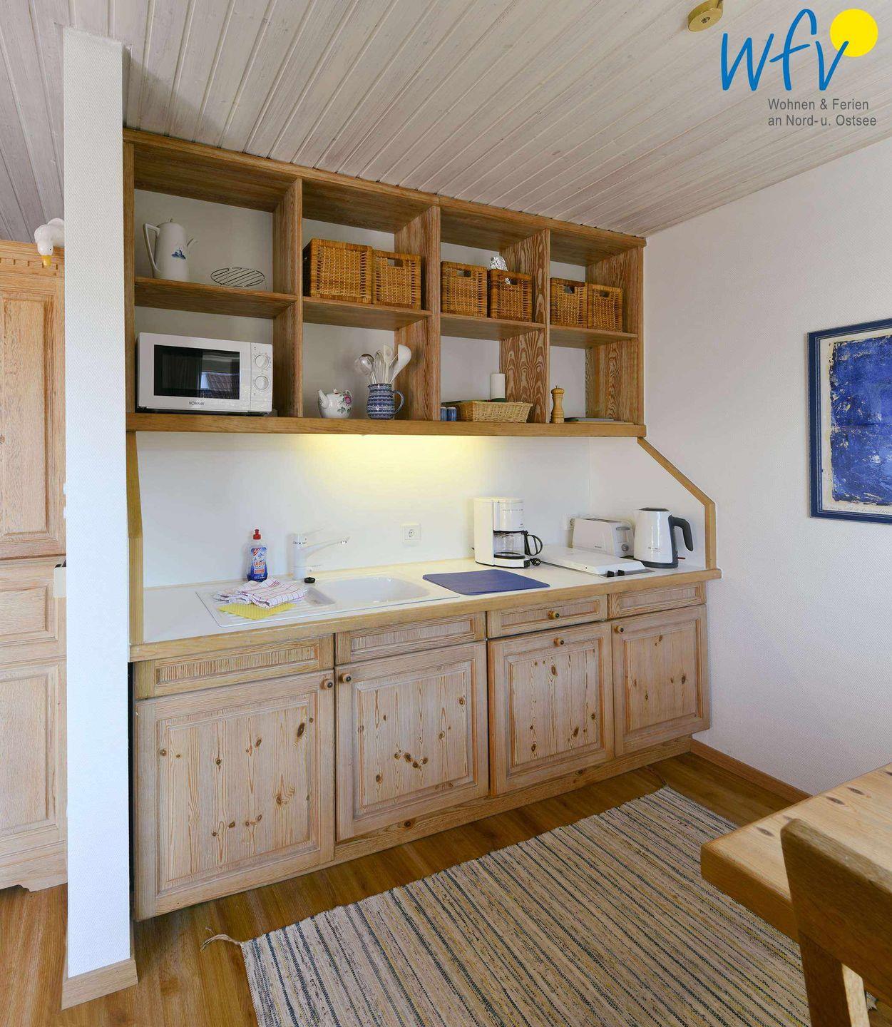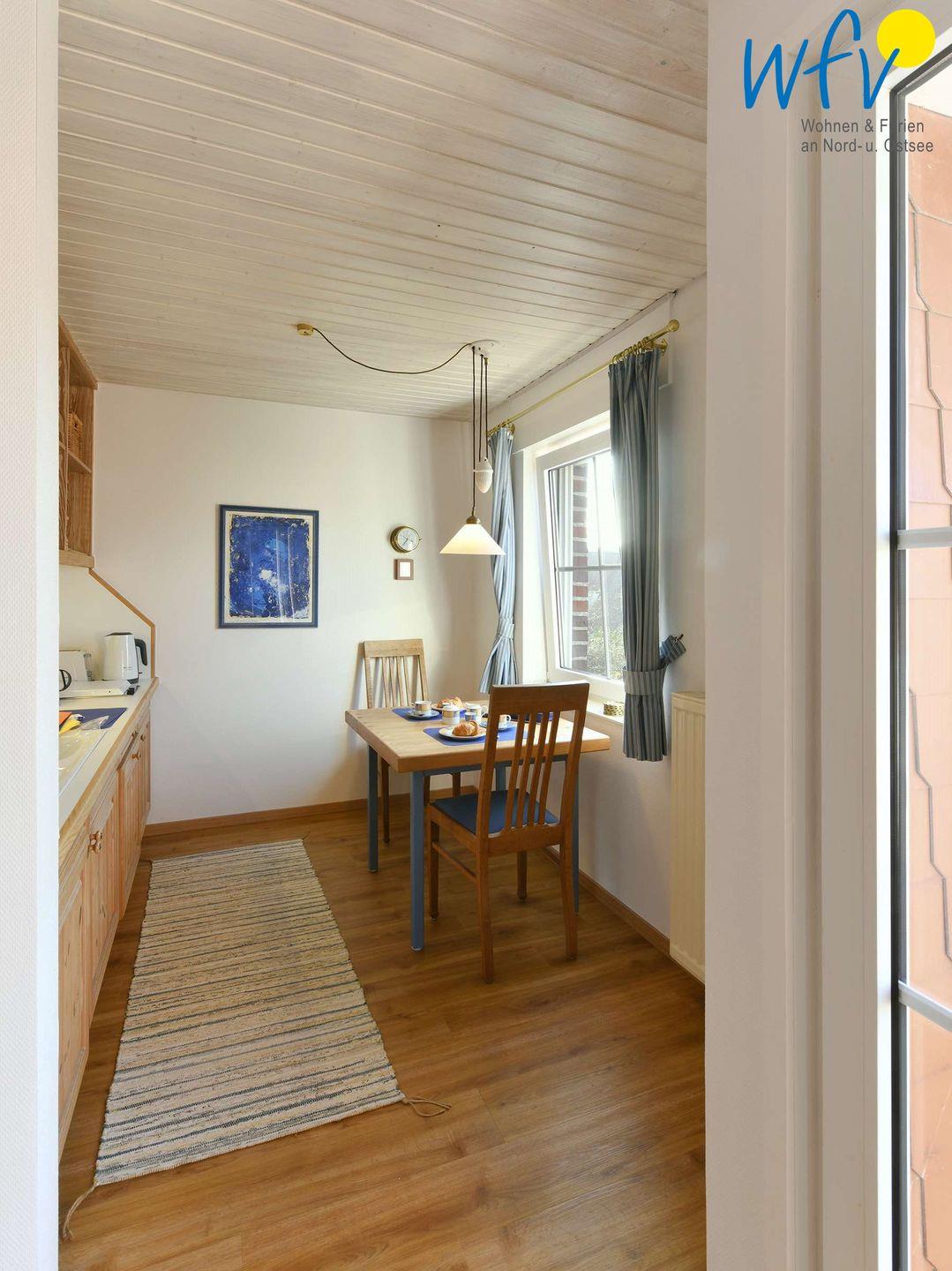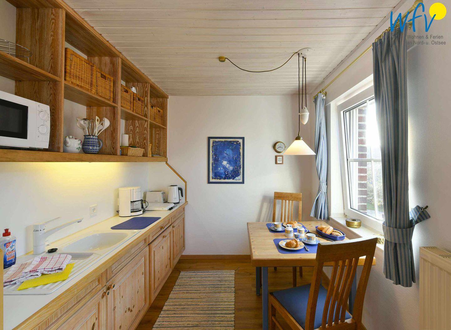 Kleine Mahlzeiten und Snacks für unterwegs lassen sich schnell und einfach in der offenen Küche zubereiten, die u.a. mit einem 2-Platten-Herd, Mikrowelle und Spülmaschine sowie diversen Kleingeräten ausgestattet ist. Vom Essplatz aus haben Sie einen schönen Blick nach draußen. So bekommt man bereits beim Frühstück Lust, einen weiteren erlebnisreichen Ferientag auf Juist zu planen.