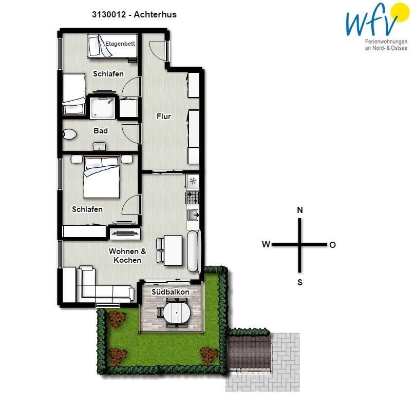 Zwei separate Schlafzimmer, ein offener Wohnraum mit integrierter Küche und Essbereich sowie ein sonniger Südbalkon bieten Ihnen jede Menge Platz für bis zu fünf Personen. Ein Schlafzimmer ist mit einem Doppelbett ausgestattet, das Dreibettzimmer mit einem Etagenbett und einem Einzelbett.