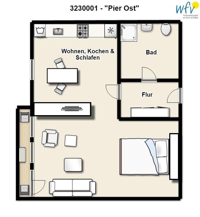 Herzlich willkommen in unserer Ferienwohnung "Pier Ost"! Das Einzimmerappartement mit großzügigem Wohn-/Schlafraum (Schrankdoppelbett) und Essbereich, einer integrierten Küchenzeile, Badezimmer und kleinem Balkon garantiert gemütliche Urlaubstage zu zweit. Von hier aus genießen Sie einen wunderbaren Blick auf das Wattenmeer und den Deich!