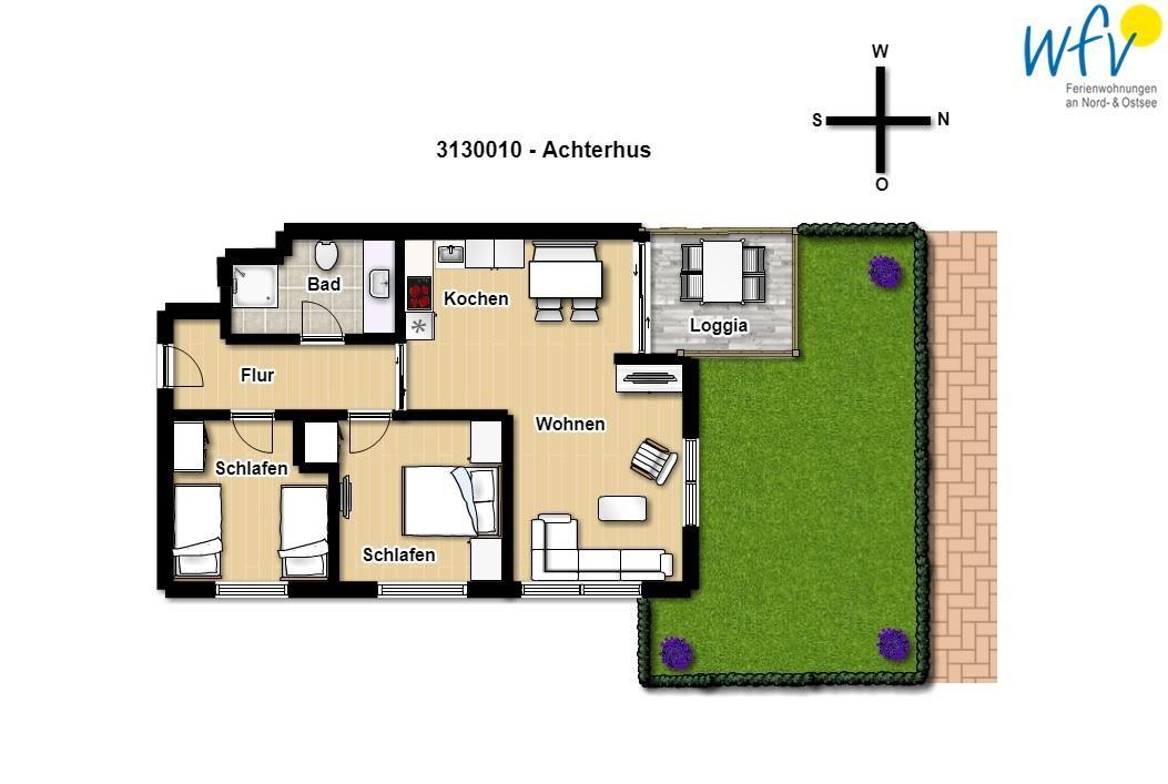 Unsere Ferienwohnung "wat`nmeer" garantiert Ihnen mit einer liebevollen Einrichtung und stilvollem Mobiliar eine Wohlfühlatmosphäre für erholsame Urlaubstage. Ein gemütlicher Wohn-Essbereich, eine voll ausgestattete Küche, zwei separate Schlafzimmer, ein Badezimmer und ein Balkon bieten Ihnen Platz für bis zu vier Personen.