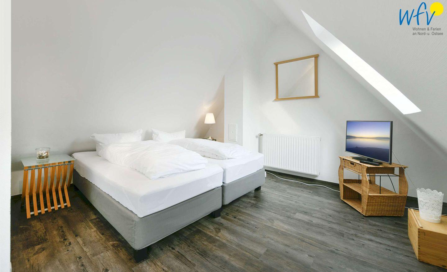 Zwei separate Schlafzimmer bieten Ihnen optimale Rückzugsmöglichkeiten. Eines der Zimmer ist mit einem kleinen Doppelbett ausgestattet (160 cm x 200 cm), in dem anderen befindet sich ein großes Boxspringbett (180 cm x 200 cm). Bei beiden Doppelbetten handelt es sich jeweils um zwei zusammengeschobene Einzelbetten (80 x 200 bzw. 90 x 200 cm).