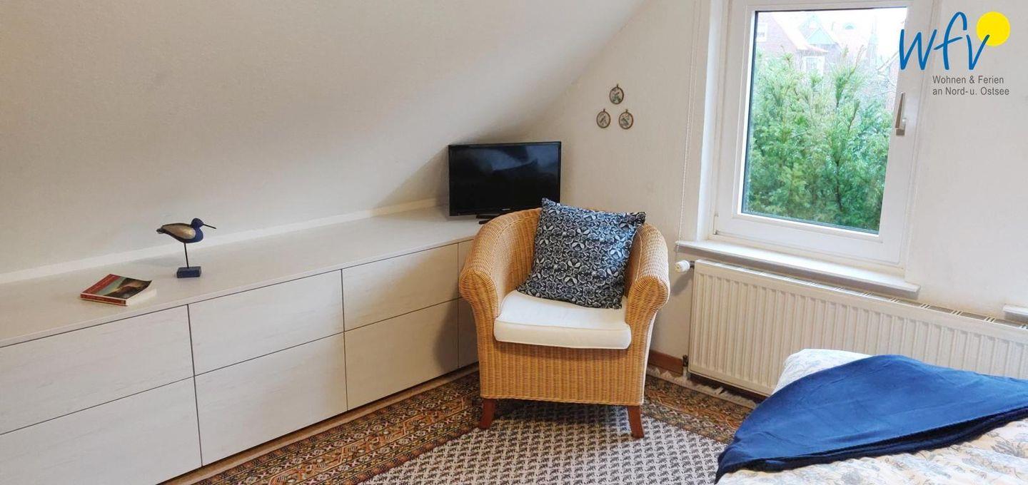 Über die Treppe erreichen Sie das im Obergeschoss gelegene separate Schlafzimmer der Ferienwohnung "Wattenmeer". Es ist mit einem bequemen Doppelbett (160 x 200 cm) und einem großen Schrank, der viel Stauraum bietet, eingerichtet. An das Schlafzimmer schließt sich ein separates WC mit Waschbecken an.