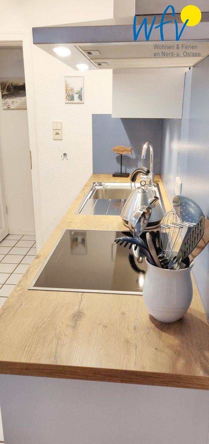 Für eine angenehme Selbstverpflegung schließt sich an das Wohnzimmer eine gut ausgestattete Küche an. Sie verfügt u.a. über einen 4- Plattenelektroherd und eine Mikrowelle sowie über diverse Kleingeräte wie Wasserkocher und Kaffeemaschine. Zudem befindet sich hier ein heller und freundlicher Essbereich.