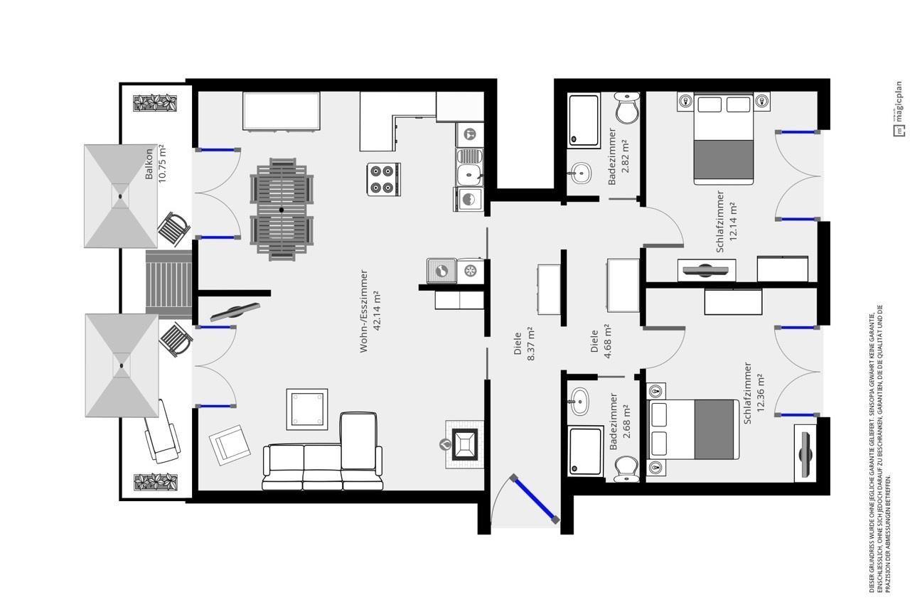 Die beiden separaten Schlafzimmer sind mit komfortablen Doppelbetten ausgestattet und besitzen jeweils ein eigenes Bad mit moderner Glasdusche und Handtuchheizung. Zudem befindet sich in den Schlafzimmern ein zusätzlicher Fernseher.