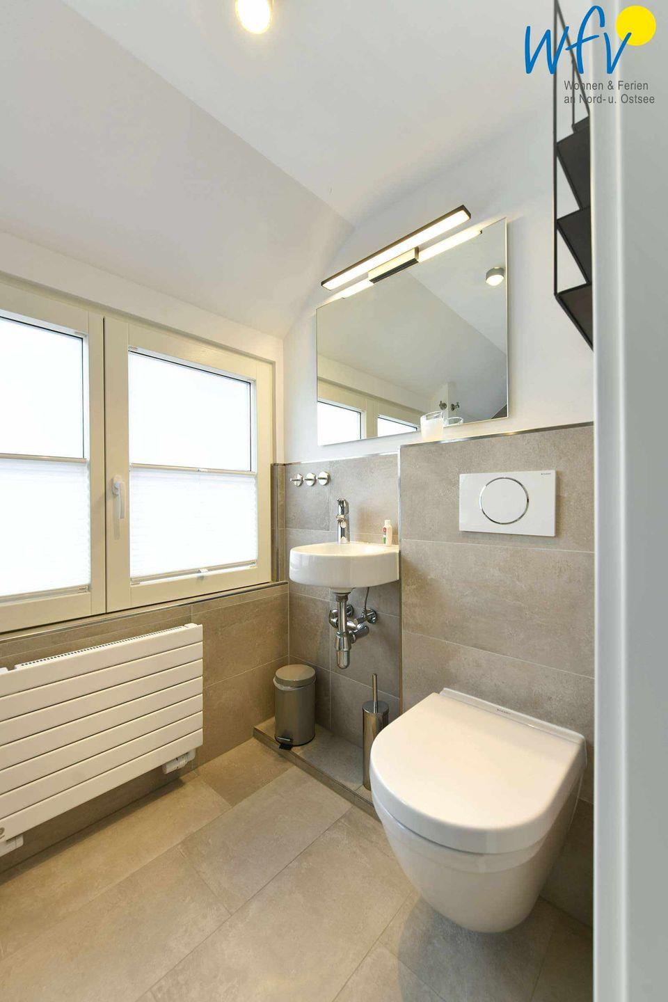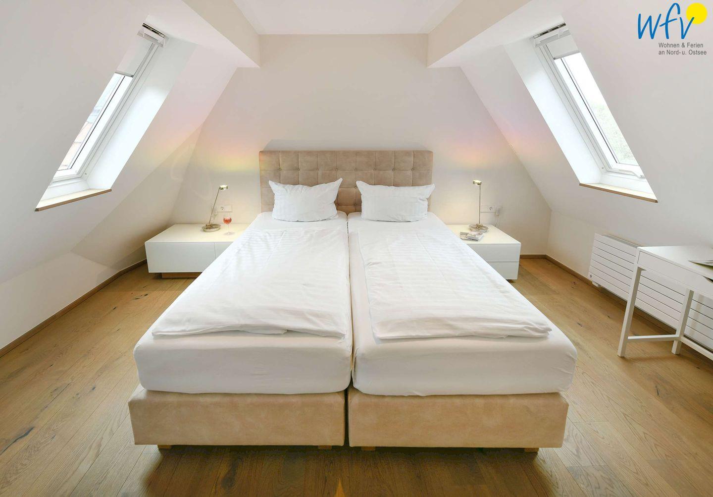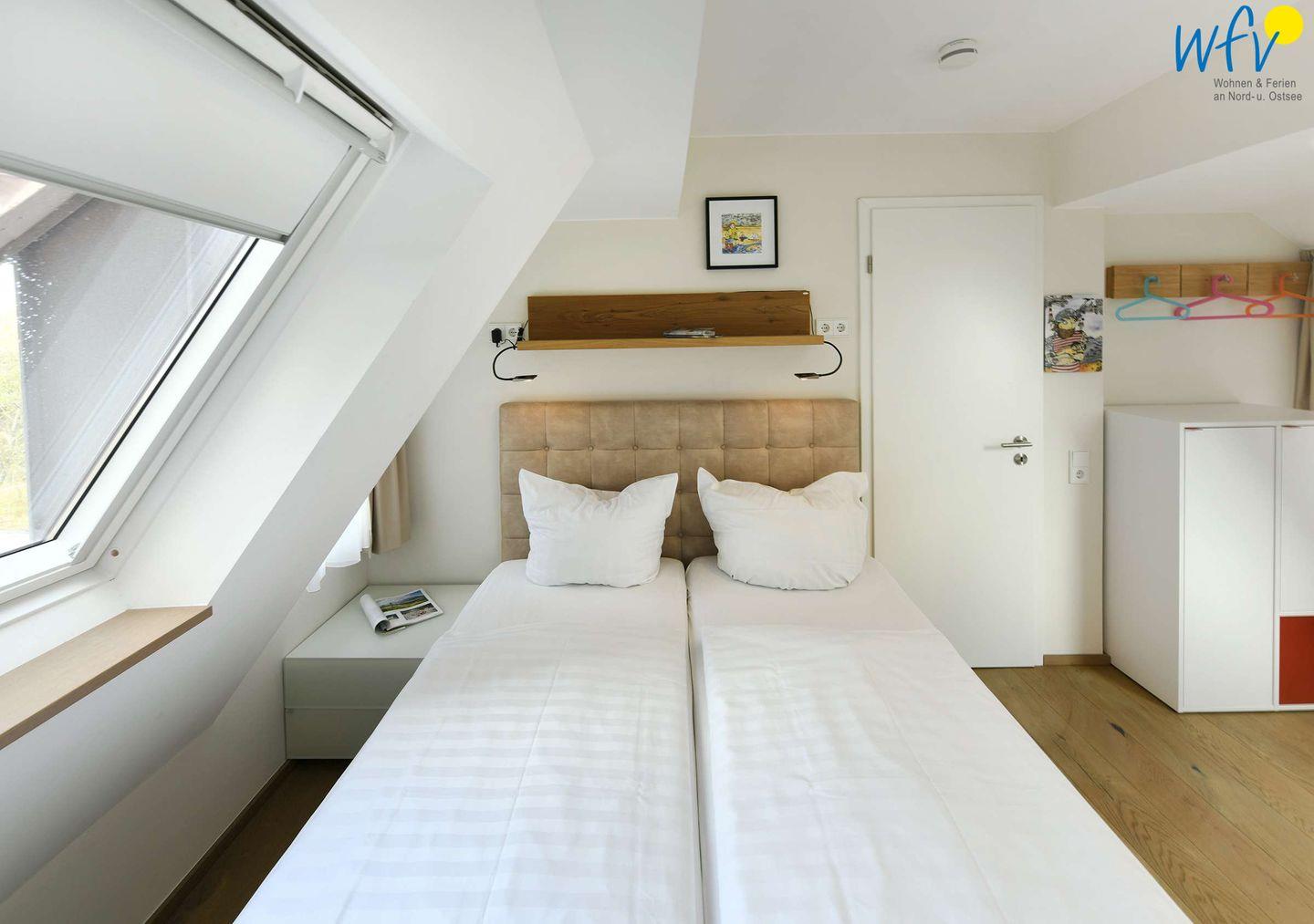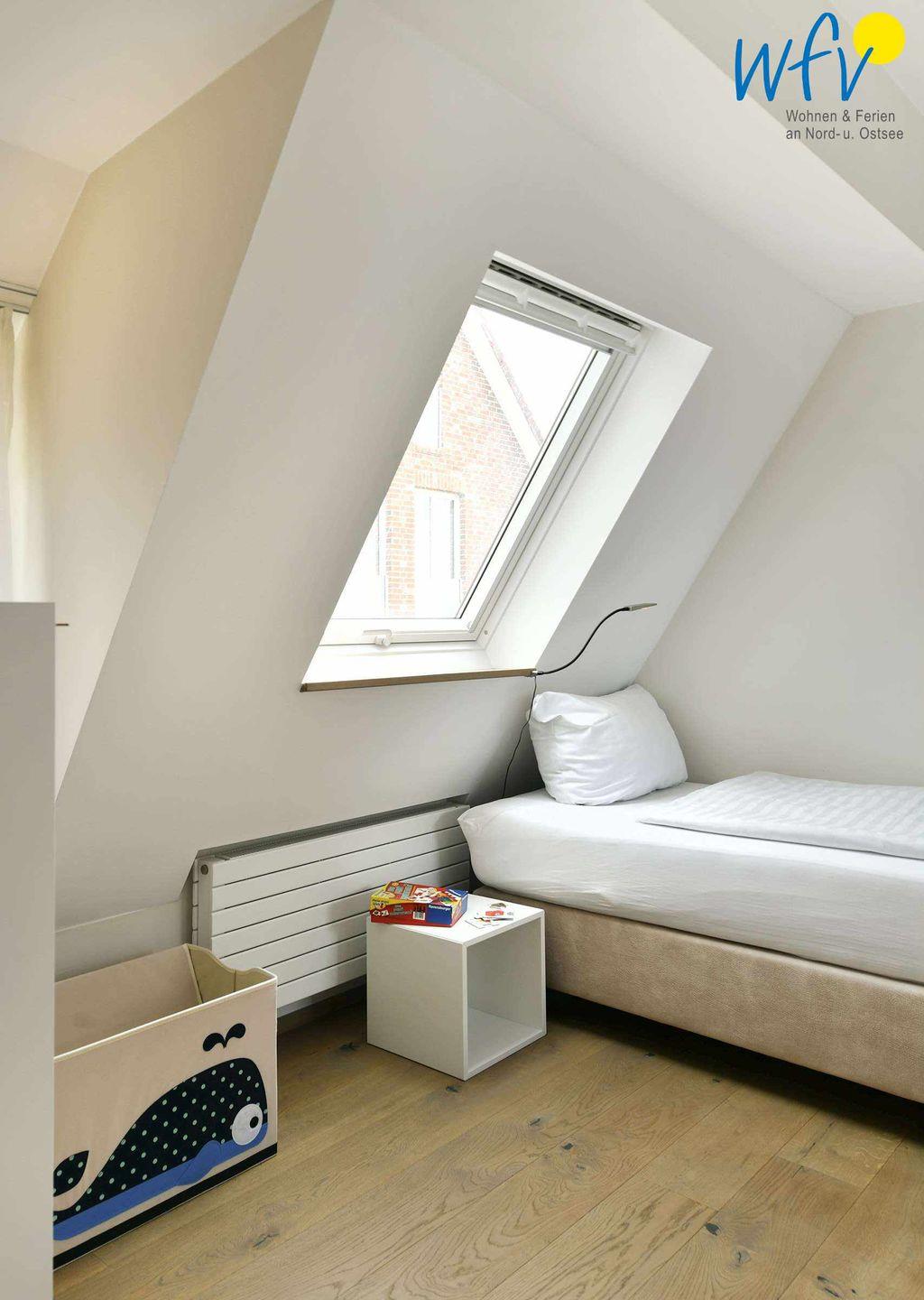 Helle moderne Möbel und ein wunderschöner Lichteinfall durch große Fenster im Wohnbereich und an den Dachschrägen im Schlafzimmer verleihen den Räumen eine sehr freundliche Atmosphäre.