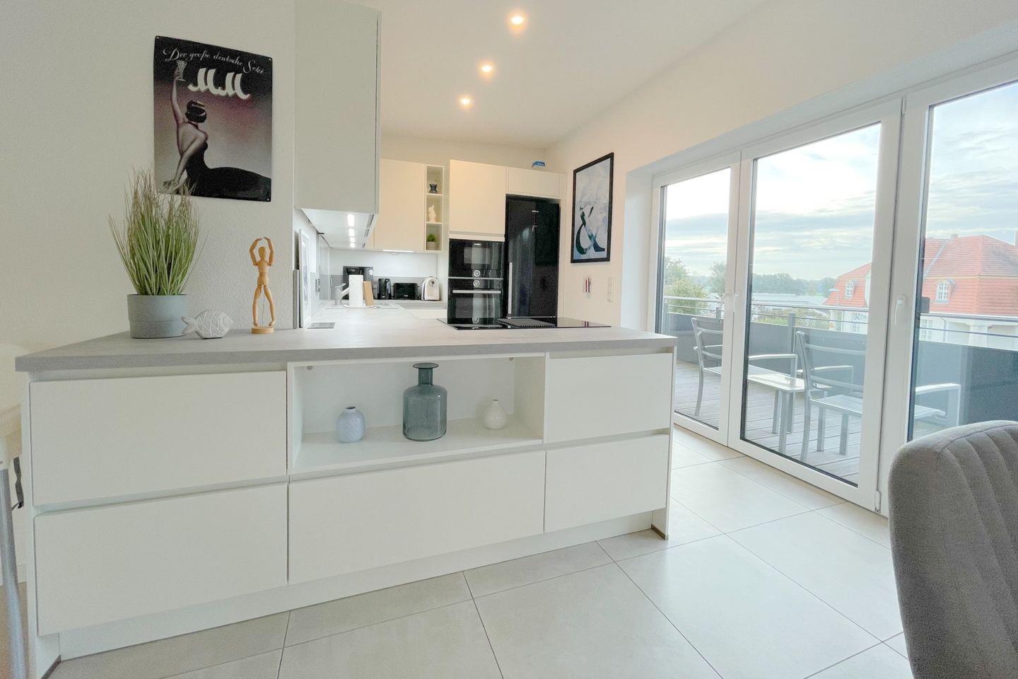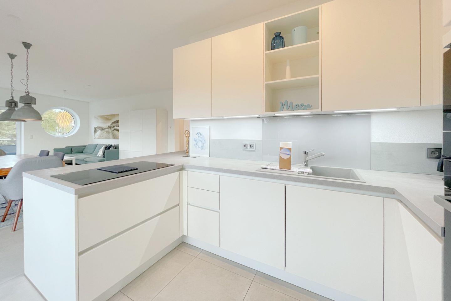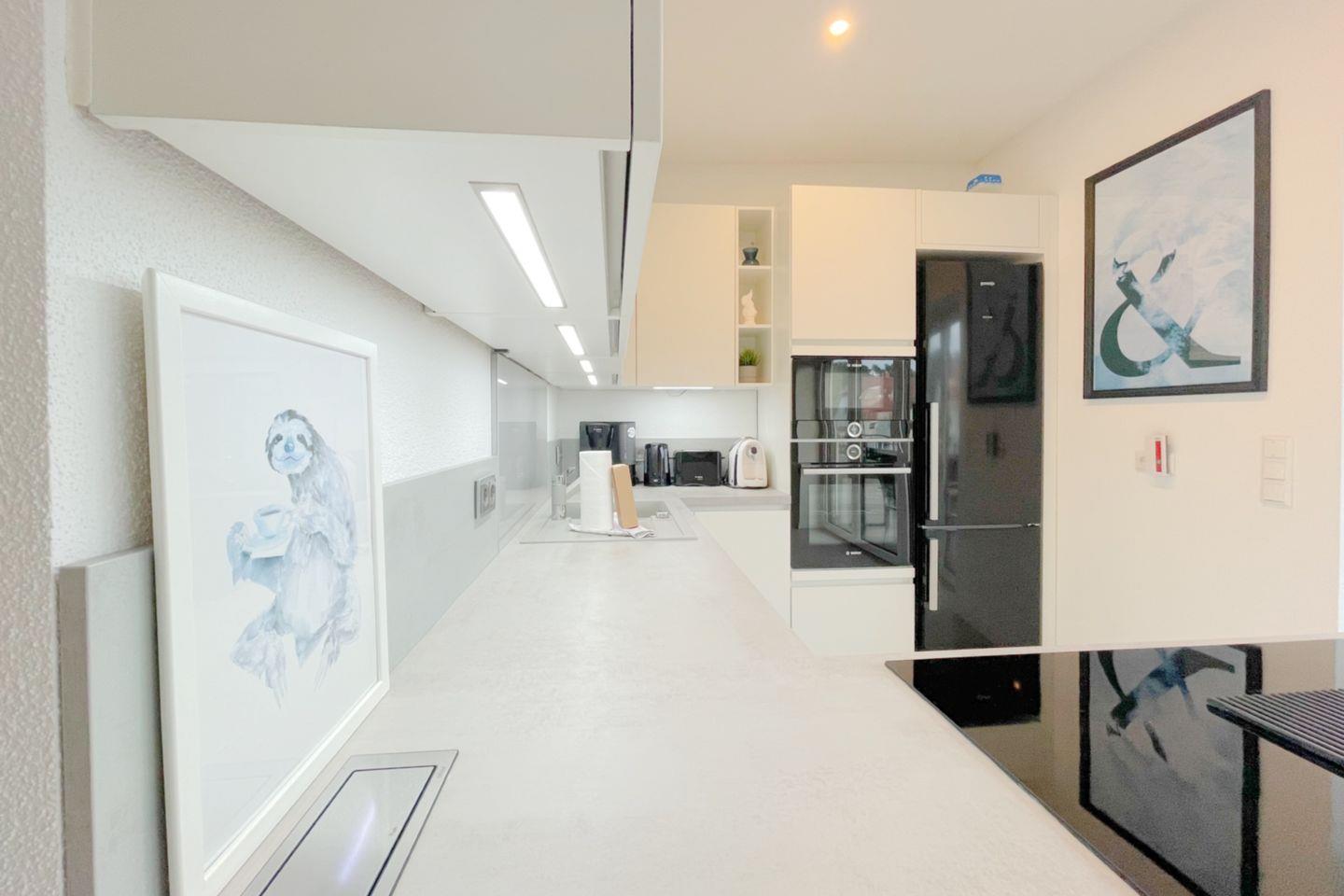 Die Ferienwohnung verfügt über zwei geschmackvoll eingerichtete Schlafzimmer, eine gemütliche Sofaecke im Wohnzimmer sowie zwei moderne Badezimmer. Die offene Küche lädt dazu ein, gemeinsam zu kochen und gesellige Abende zu verbringen. Sie ist voll ausgestattet mit allem, was Sie benötigen: von einem Induktionsherd über einen Backofen bis hin zu einer Spülmaschine und einer Mikrowelle. Zu Ihrer Bequemlichkeit stehen Geschirr und Besteck bereit, sodass Sie direkt mit dem Kochen loslegen können.