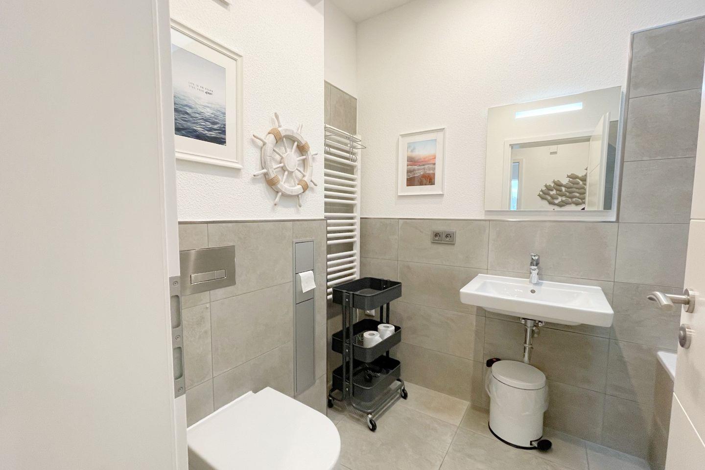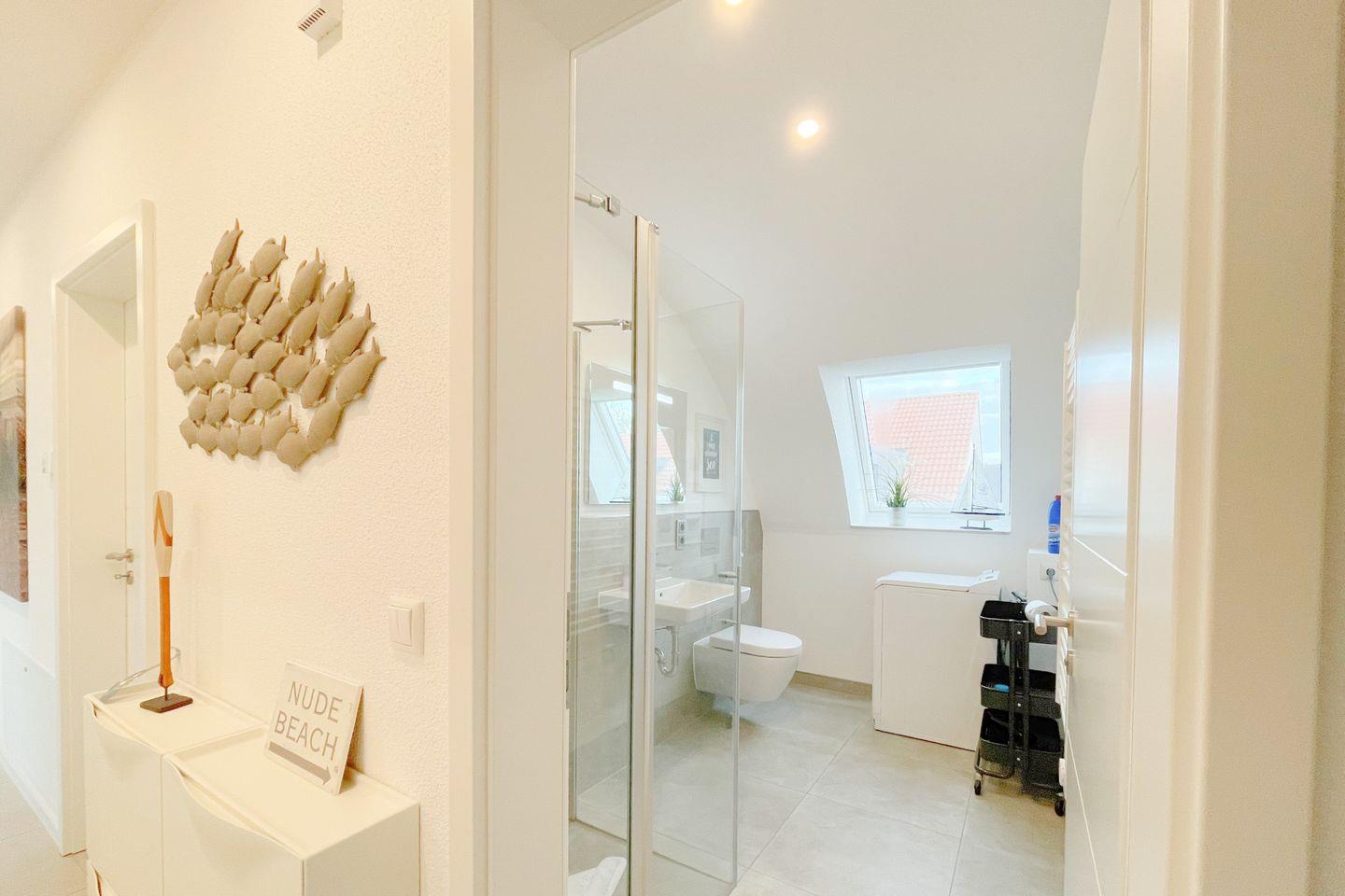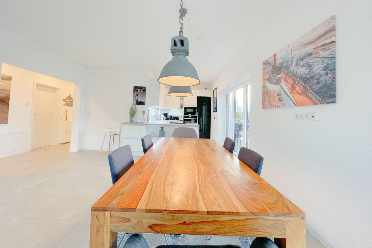 Die Ferienwohnung verfügt über zwei geschmackvoll eingerichtete Schlafzimmer, eine gemütliche Sofaecke im Wohnzimmer sowie zwei moderne Badezimmer. Die offene Küche lädt dazu ein, gemeinsam zu kochen und gesellige Abende zu verbringen. Sie ist voll ausgestattet mit allem, was Sie benötigen: von einem Induktionsherd über einen Backofen bis hin zu einer Spülmaschine und einer Mikrowelle. Zu Ihrer Bequemlichkeit stehen Geschirr und Besteck bereit, sodass Sie direkt mit dem Kochen loslegen können.