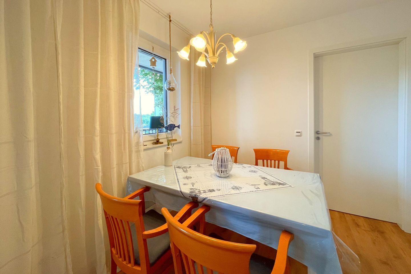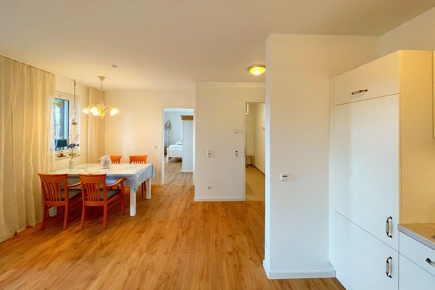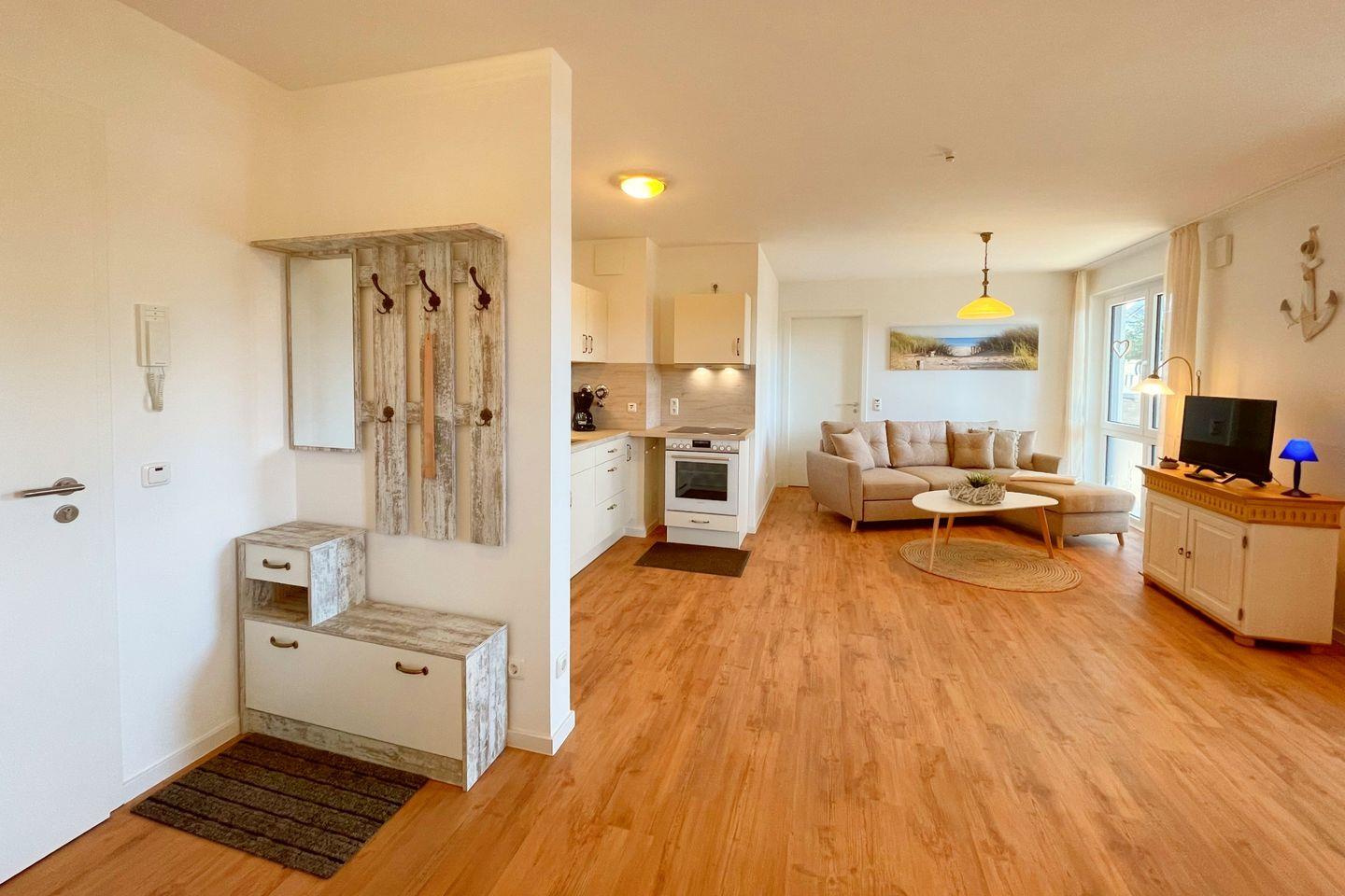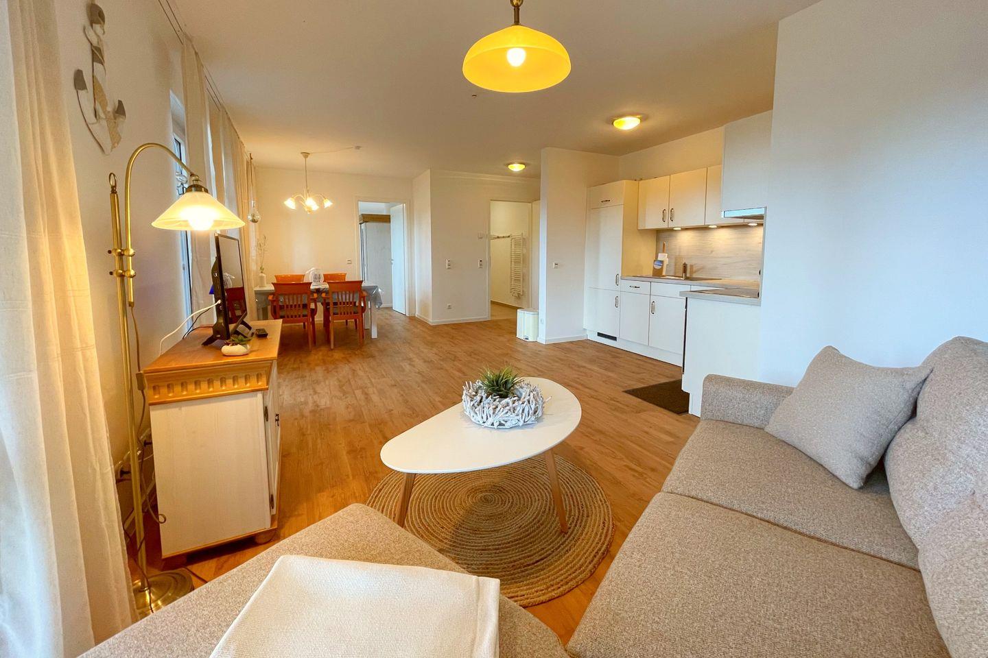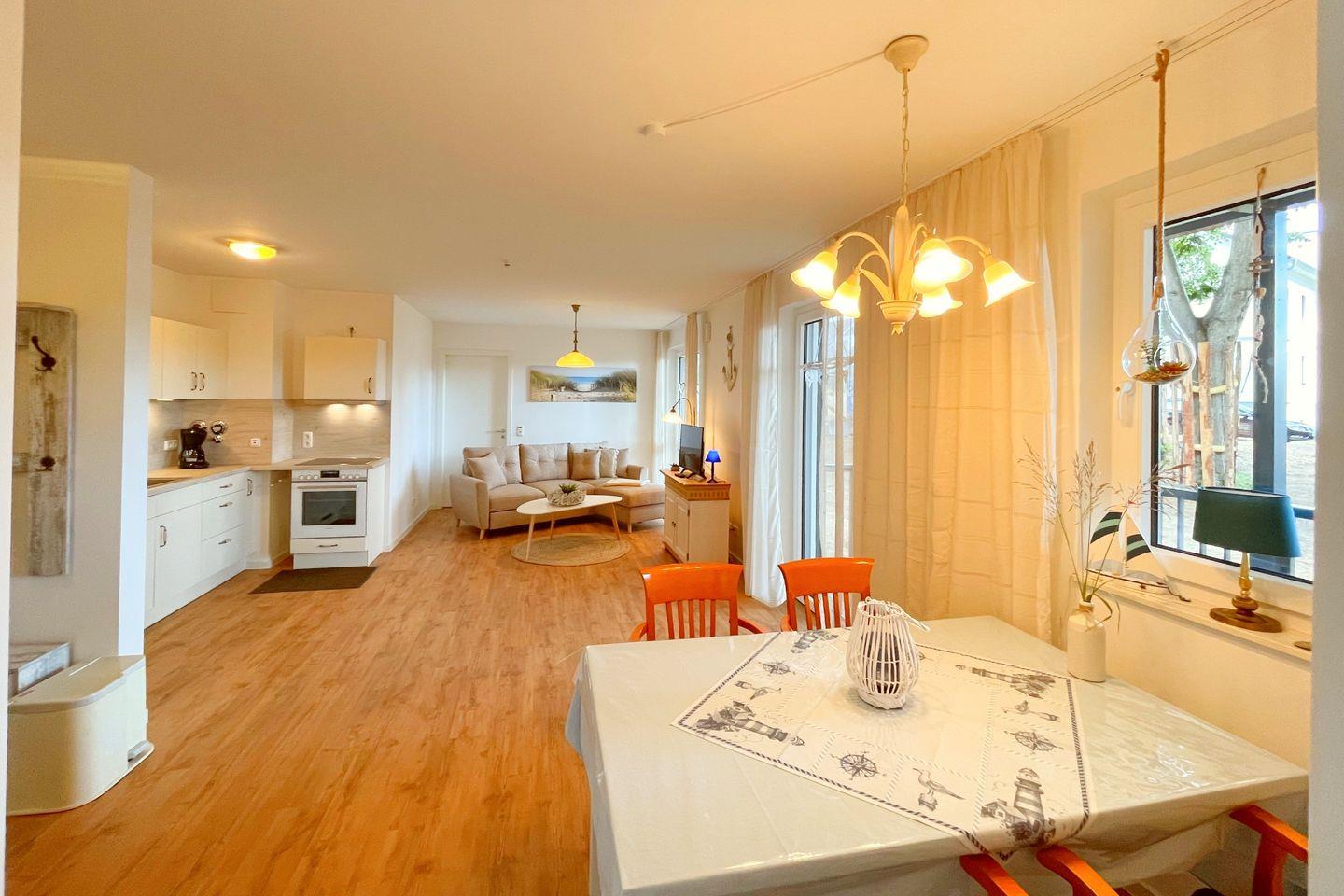 Die Ferienwohnung besticht durch ein stilvolles, offenes Wohnkonzept. Der Wohnbereich ist mit einer bequemen Sofaecke ausgestattet und lädt dazu ein, gemütliche Abende vor dem Fernseher zu verbringen. Der digitale TV-Anschluss sorgt für abwechslungsreiche Unterhaltung. Vom Essbereich aus haben Sie direkten Zugang zur überdachten Terrasse, auf der Sie die frische Ostseeluft genießen können.