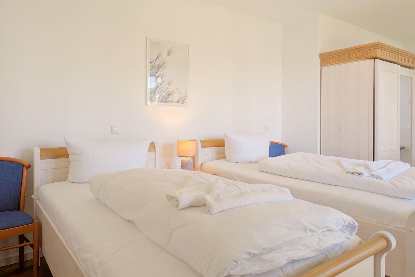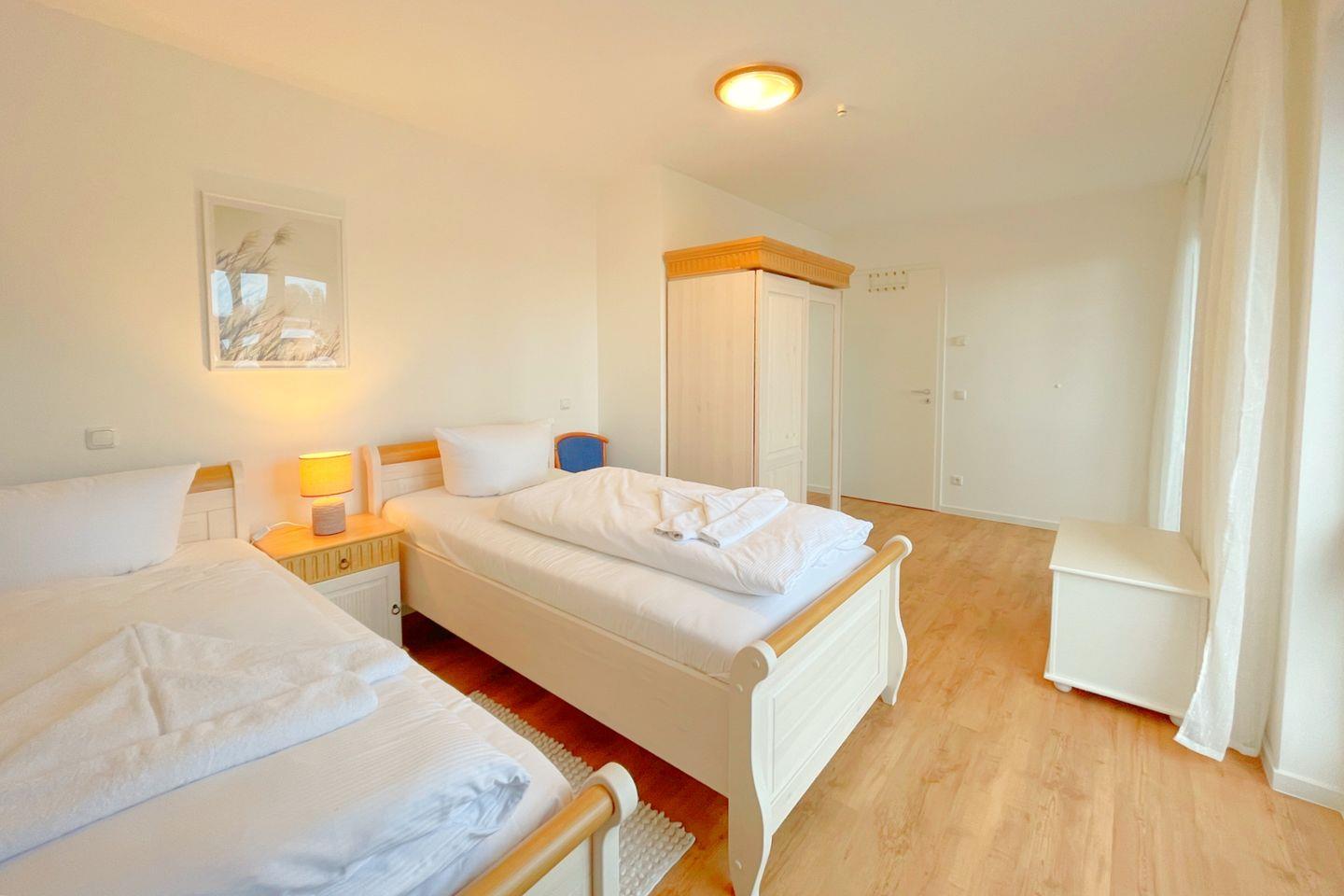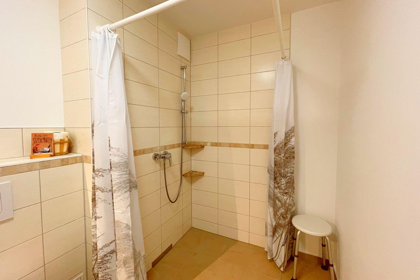 Das Schlafzimmer bietet einen Rückzugsort mit zwei komfortablen Einzelbetten, welche für einen erholsamen Schlaf sorgen. Das Badezimmer ist mit einer bodengleichen Dusche, einem Waschbecken und einem WC ausgestattet. Die Fußbodenheizung sorgt für ein angenehmes Raumklima, auch an kühleren Tagen.