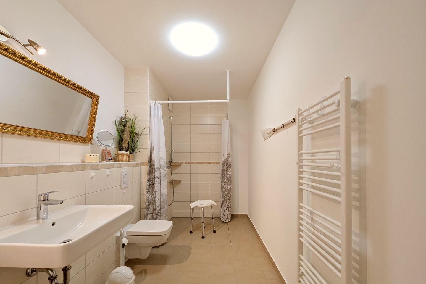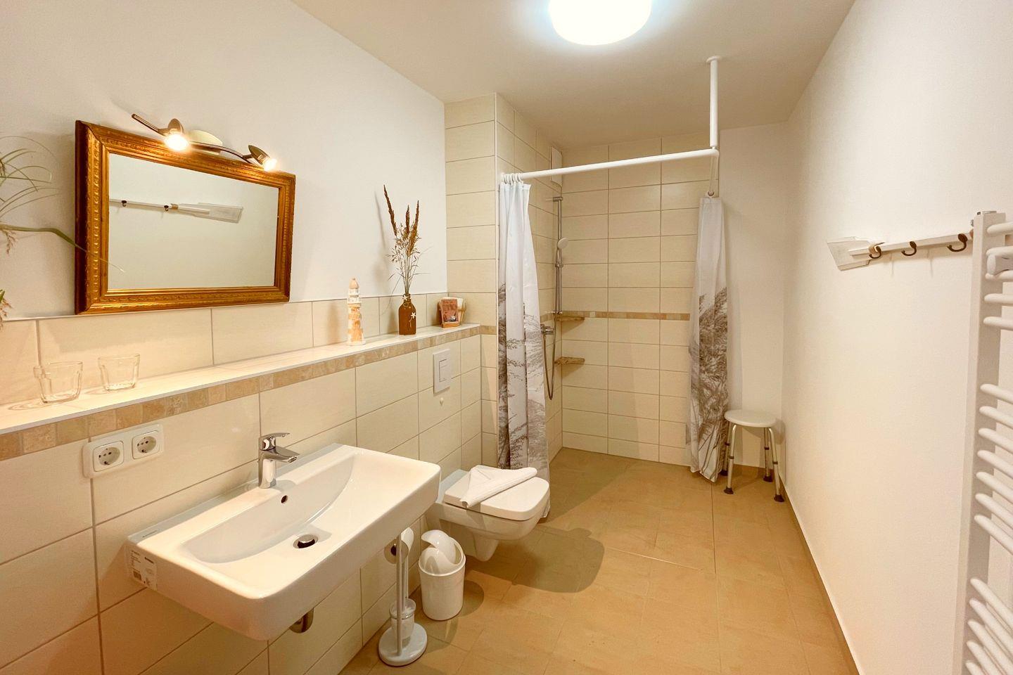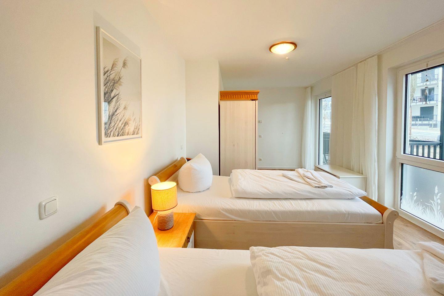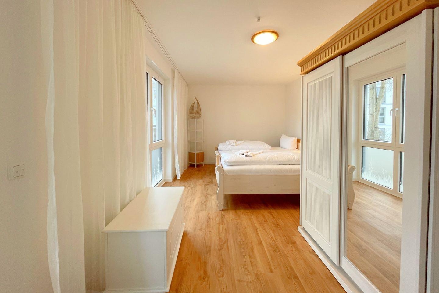 Das Schlafzimmer bietet einen Rückzugsort mit zwei komfortablen Einzelbetten, welche für einen erholsamen Schlaf sorgen. Das Badezimmer ist mit einer bodengleichen Dusche, einem Waschbecken und einem WC ausgestattet. Die Fußbodenheizung sorgt für ein angenehmes Raumklima, auch an kühleren Tagen.