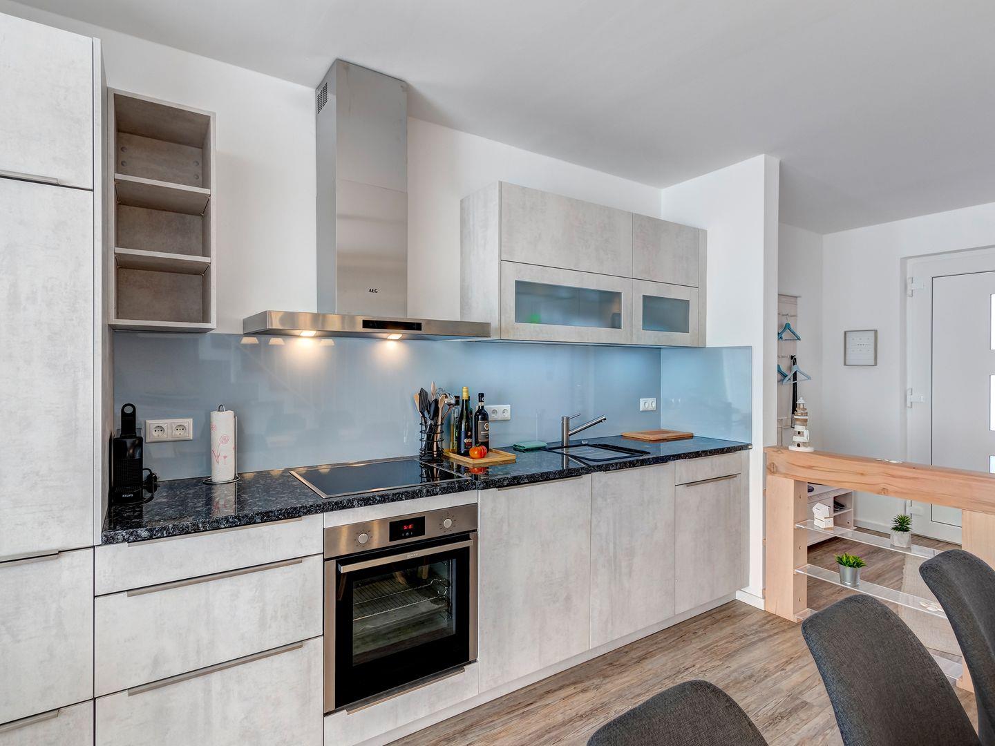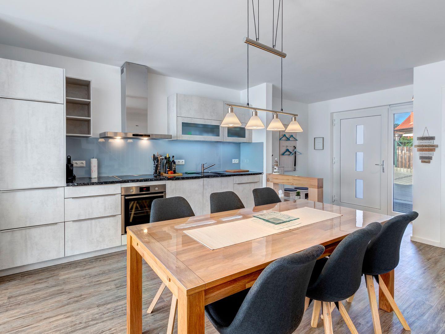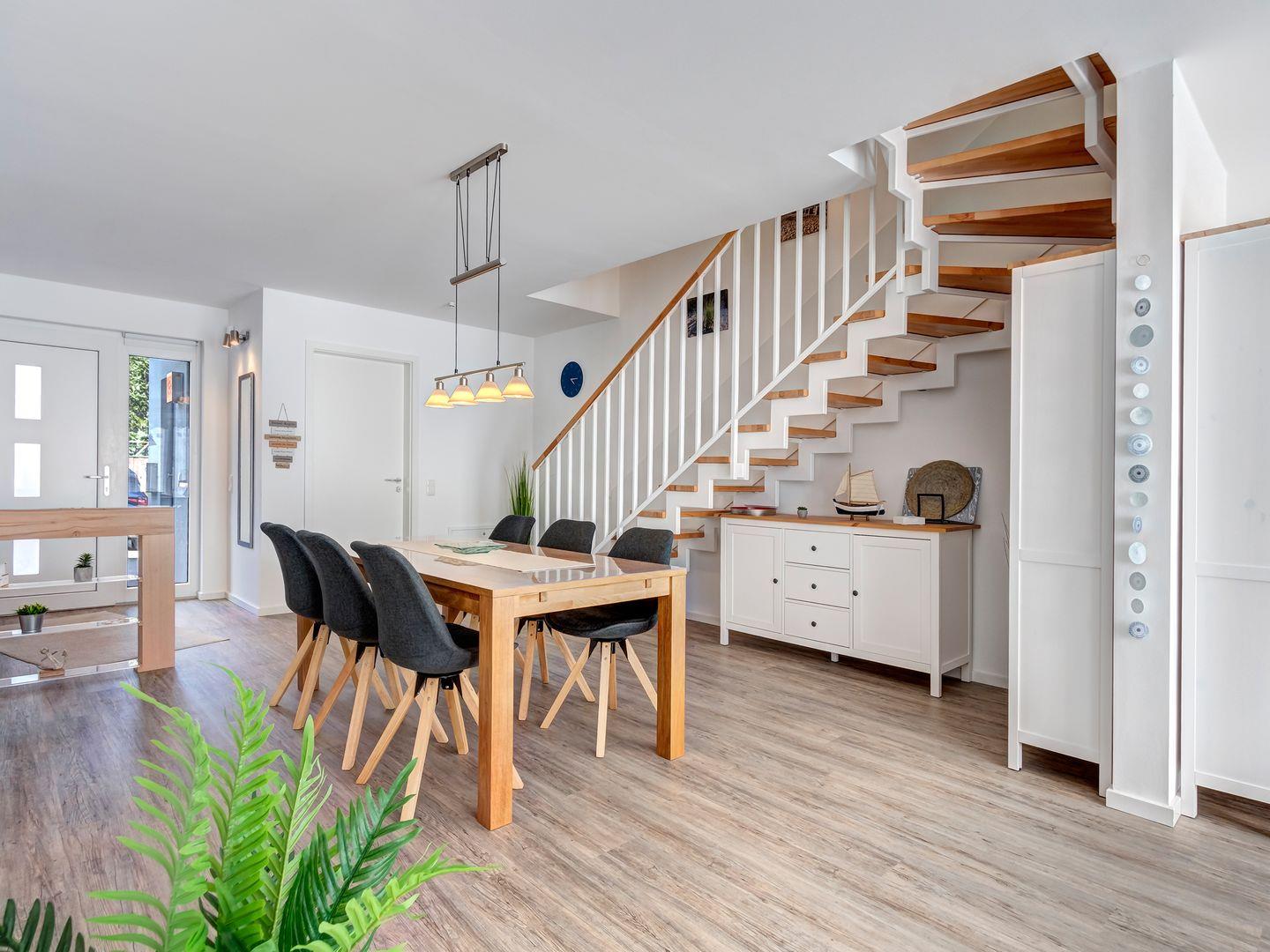 Das lichtdurchflutete Erdgeschoss empfängt dich mit einer topmodernen Einbauküche, die keine Wünsche offenlässt. Direkt angrenzend findest du die sonnige Terrasse, die mit einem gemütlichen Strandkorb und stilvollen Terrassenmöbeln zum Entspannen und Genießen einlädt.