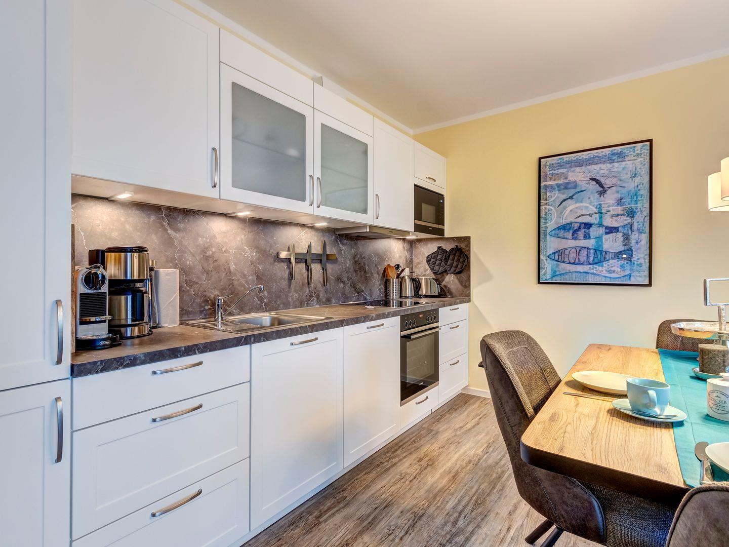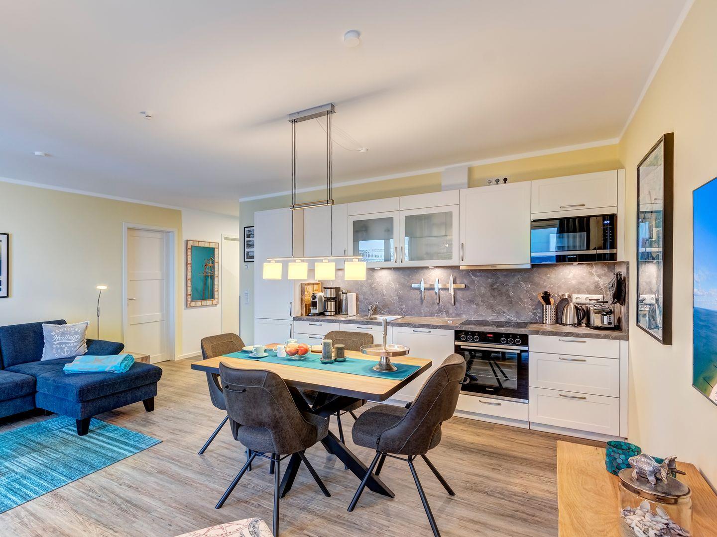 Mit viel Liebe zum Detail eingerichtet bietet sie mit einem Schlafzimmer, einem großen Wohnraum mit Küchenzeile, einem Duschbad mit Rainshower, WLAN, Tiefgaragenstellplatz für Ihr Auto und großem Balkon den idealen Ort für eine „Inselauszeit“. Im Hauswirtschaftsraum befinden sich Waschmaschine und Trockner und Platz für den Wäscheständer nicht nur für Ihre Badesachen.
