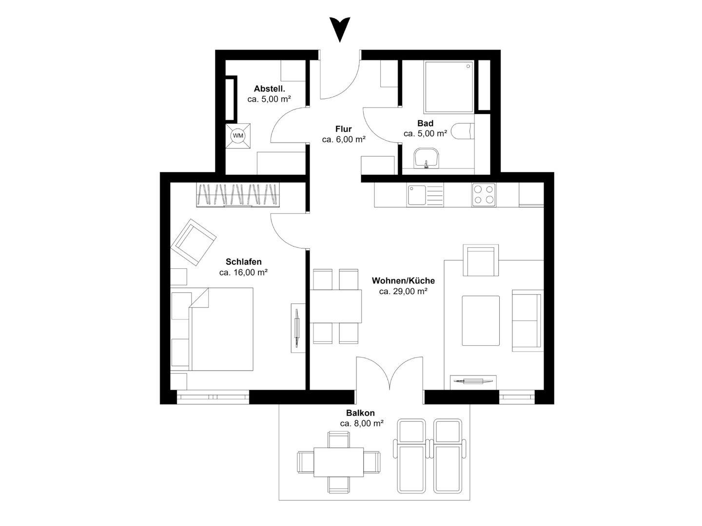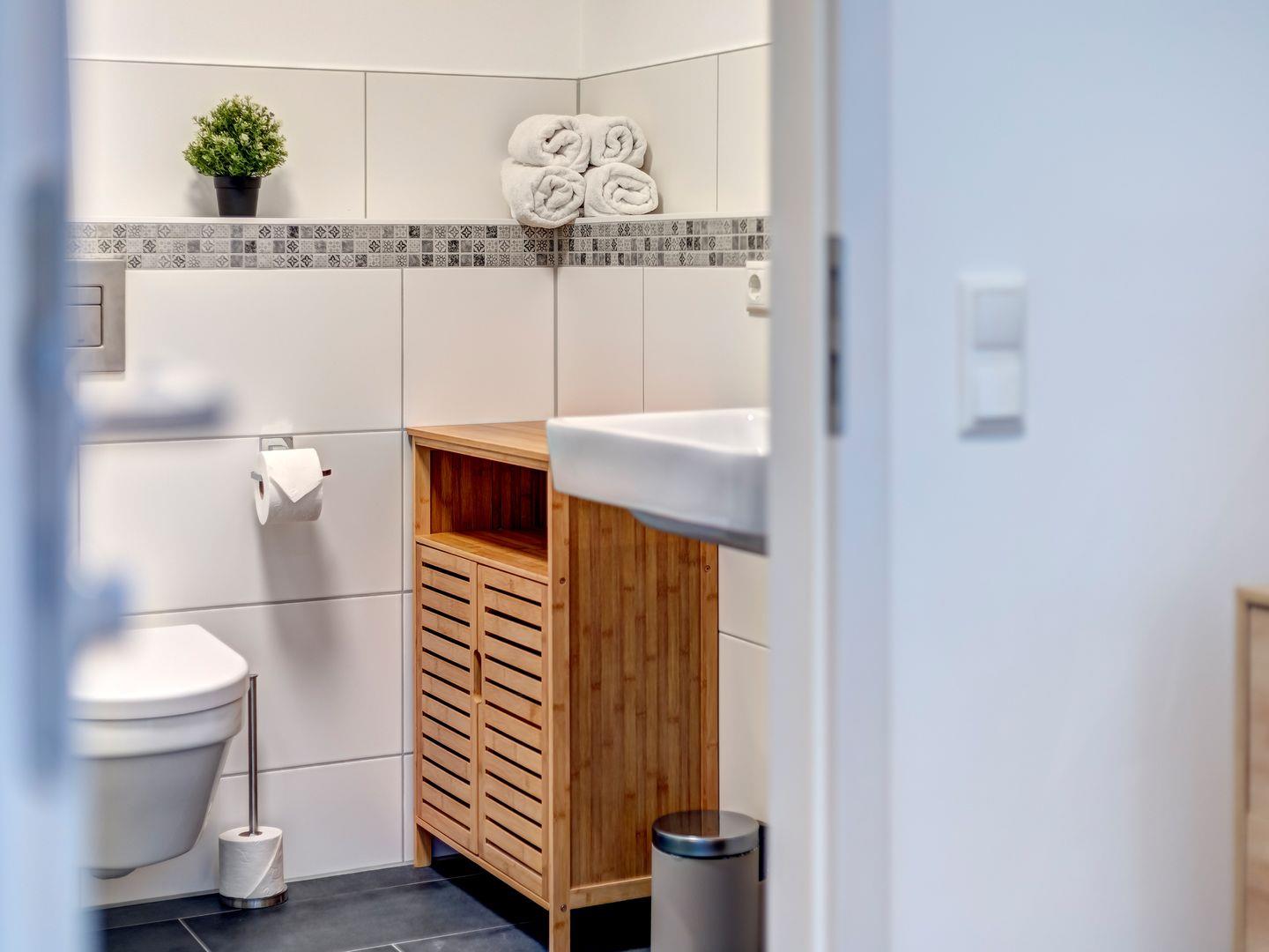 Die 65 qm große, ebenerdig erreichbare Ferienwohnung mit Fußbodenheizung bietet einen großzügigen Wohn- und Essbereich, ein Schlafzimmer mit einem großen Bett, ein modernes Bad, Flur und Hauswirtschaftsraum. Ideal für einen Familienurlaub oder zu zweit.