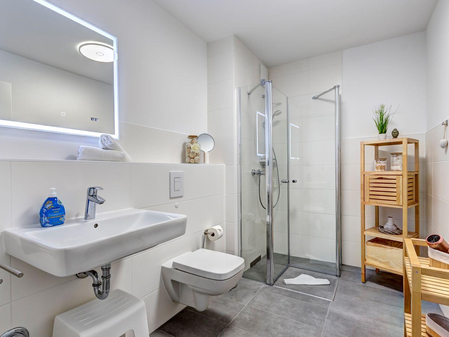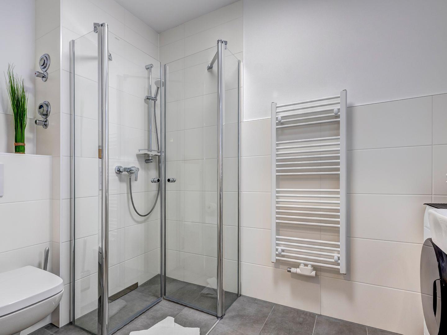 Zusätzlich zu den Annehmlichkeiten des Wohnbereichs finden Sie im modernen Badezimmer eine Waschmaschine für Ihren Komfort.