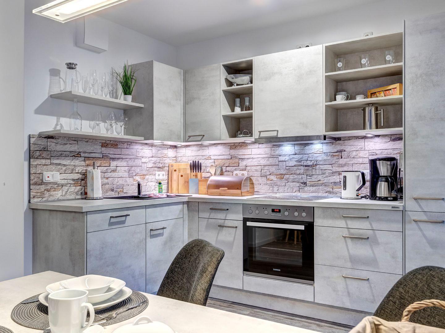 Genießen Sie den offenen Wohnbereich mit einer voll ausgestatteten Küche, die sich zum überdachten Balkon hin öffnet. Dort können Sie den beruhigenden Blick auf den Wald und die frische Luft genießen.