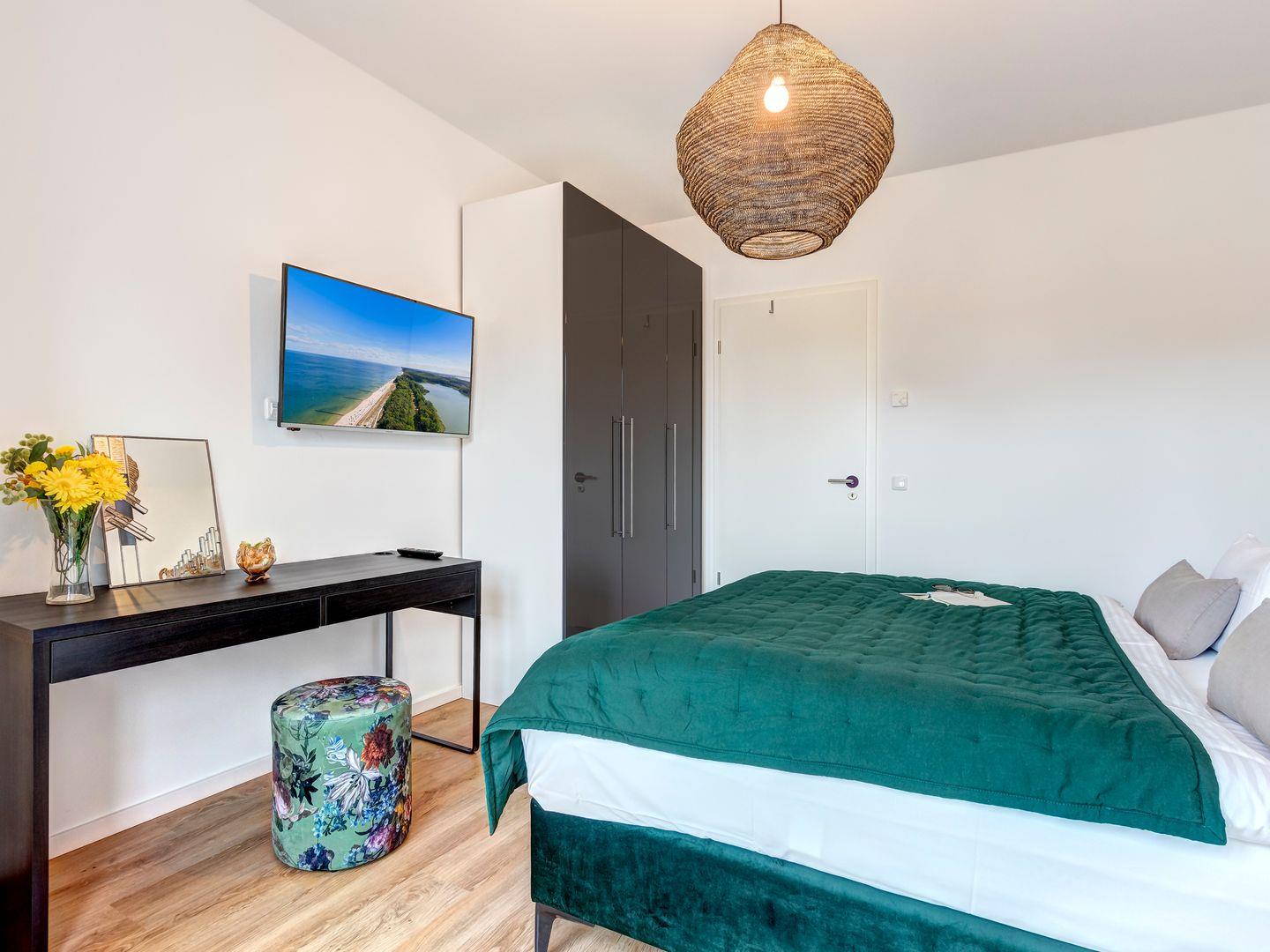 Die beiden Schlafräume sind jeweils mit einem behaglichen Doppelbett ausgestattet. In den vorhandenen Kleiderschränken findet ihre Urlaubsgarderobe Platz und die kleinen Tische mit den gemütlichen Sitzmöglichkeiten dienen als Workation Stationen, Schminktisch oder als Schreibtisch für die Urlaubspost.