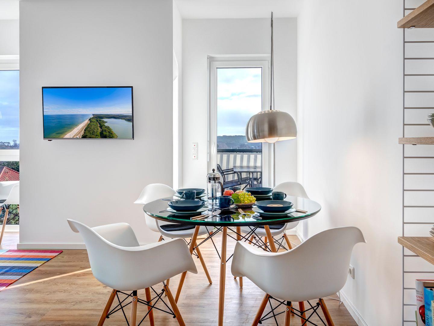Modern, hochwertig und ein Hauch Minimalismus über den Dächern von Kölpinsee - dieses traumhafte Appartement im Dachgeschoss begrüßt maximal 4 Personen aufs herzlichste. Auf 80 Quadratmeter Wohnfläche erwarten Sie ein großzügiger Wohn-/Essbereich. Die große Sofalandschaft besticht durch den herrlichen Blick in den Ort. Der runde Esstisch mit den bequemen Schalensesseln empfängt Sie zum gemeinsamen Frühstück.