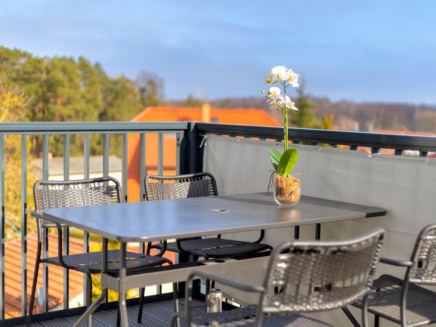 Der großzügige Balkon bietet neben einem Tisch mit 4 Stühlen noch zusätzlich Platz für ein Outdoor Sofa. Vom Balkon haben Sie eine wunderbare Aussicht auf den Kölpinsee. Ein Appartement zum Wohlfühlen – wir freuen uns auf Sie.