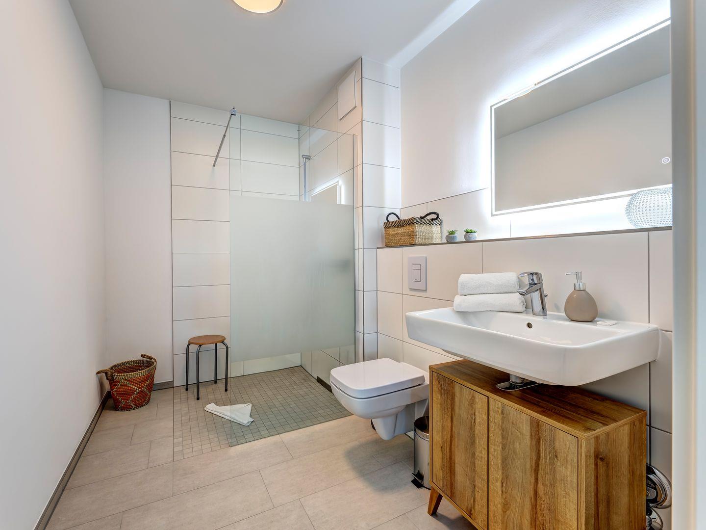 Das Badezimmer ist mit einer ebenerdigen Dusche ausgestattet und verfügt über eine Waschmaschine, um Ihnen den Aufenthalt so angenehm wie möglich zu gestalten.