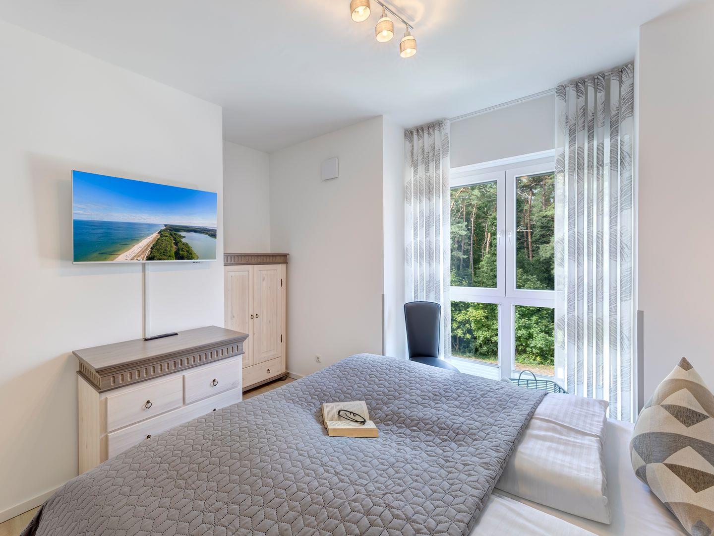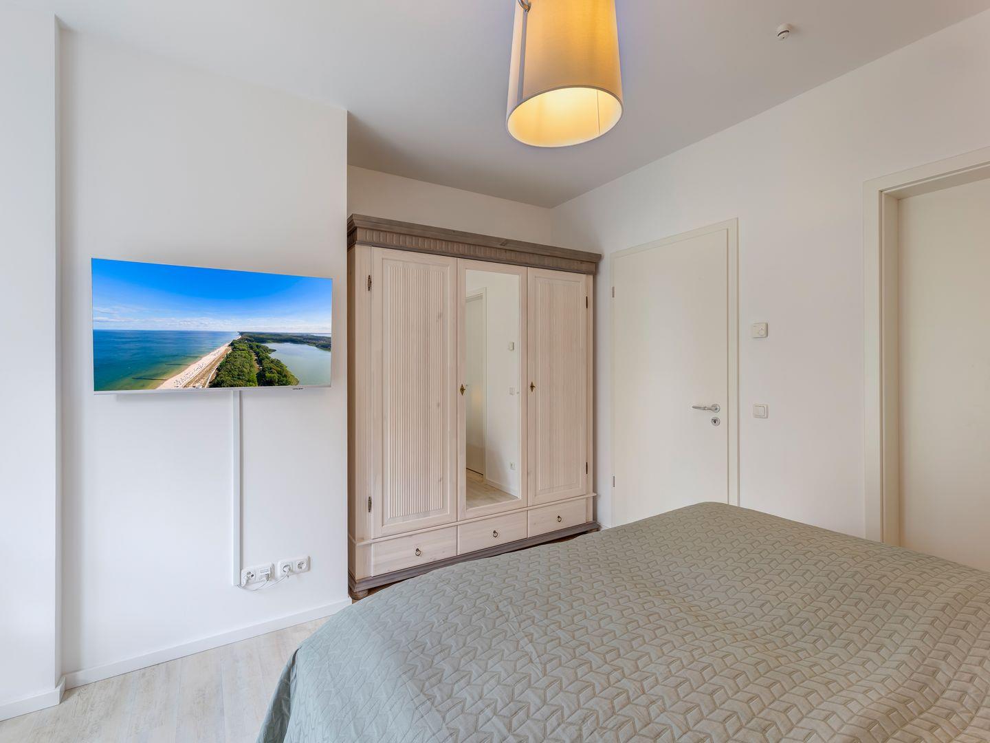 Auf Ihren erholsamen Schlaf müssen Sie auch im Urlaub nicht verzichten. Die Schlafzimmer sind jeweils mit einem Boxspringbett einem 43 Zoll Smart- TV und geräumigen Kleiderschrank und Kommoden ausgestattet. Einen direkten Zugang zum Duschbad haben Sie von einem der Schlafzimmer.