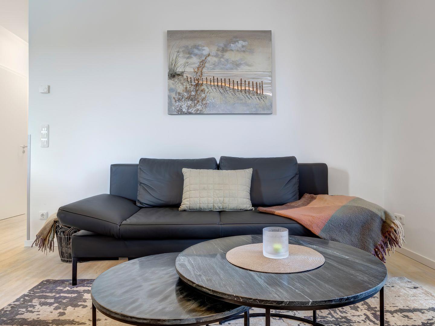 Der offene Wohn – Essbereich bietet Ihnen im Küchenbereich sämtlichen Freiraum für Ihre Bedürfnisse und stellt Ihnen eine Vollausstattung zur Verfügung. Im Wohnbereich finden Sie nach einem ausgefüllten Urlaubstag Entspannung auf dem Ledersofa (auch als Aufbettung für bis zu 2 Personen nutzbar), dem Hochlehnsessel oder vor dem 55 Zoll Smart- TV entsprechende Entspannung.