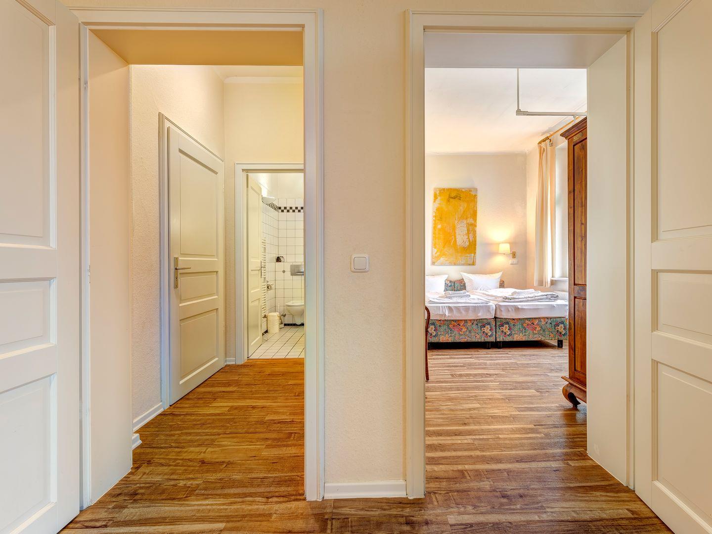 - das helle Schlafzimmer ist mit zwei nebeneinander stehenden Einzelbetten ausgestattet, die durch ein gemeinsames Kopfteil verbunden sind