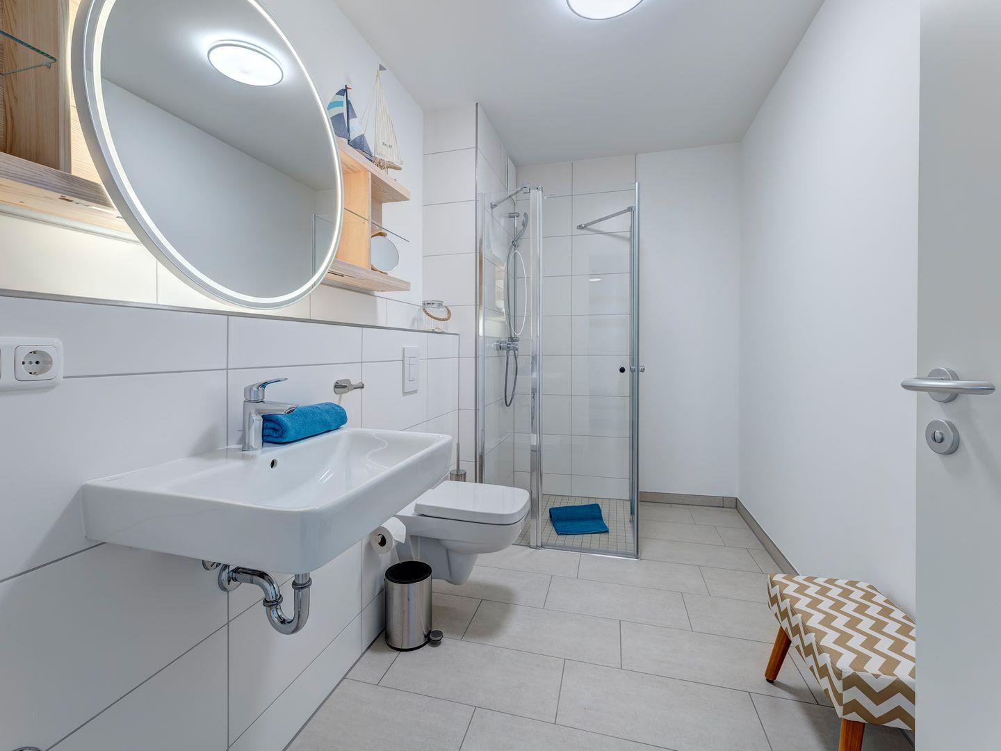 Das moderne Badezimmer verfügt über eine großzügige ebenerdige Dusche.