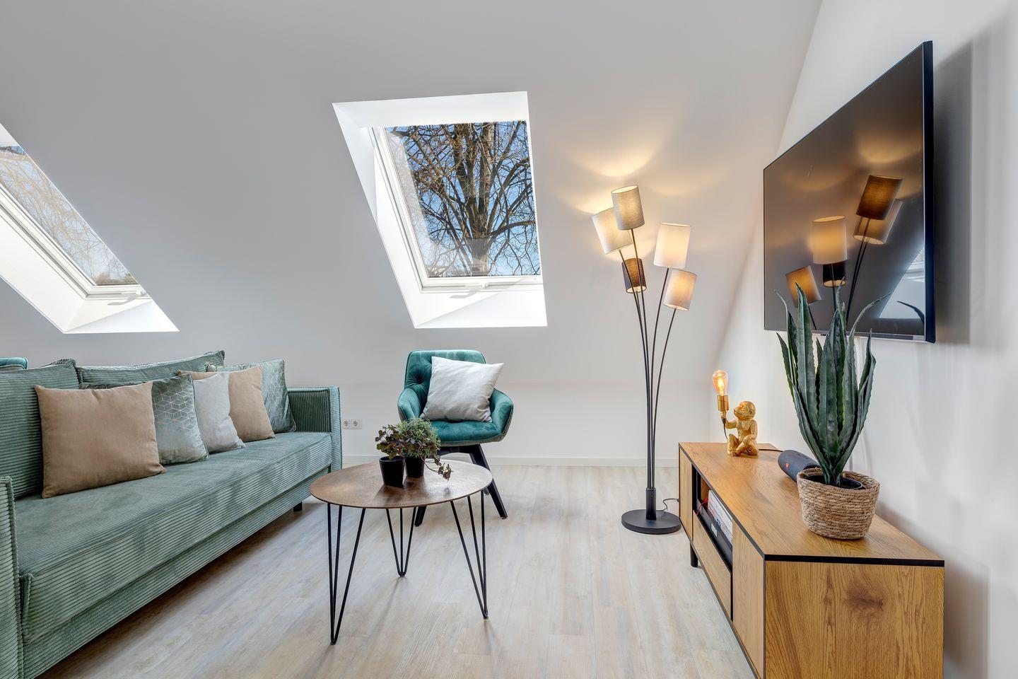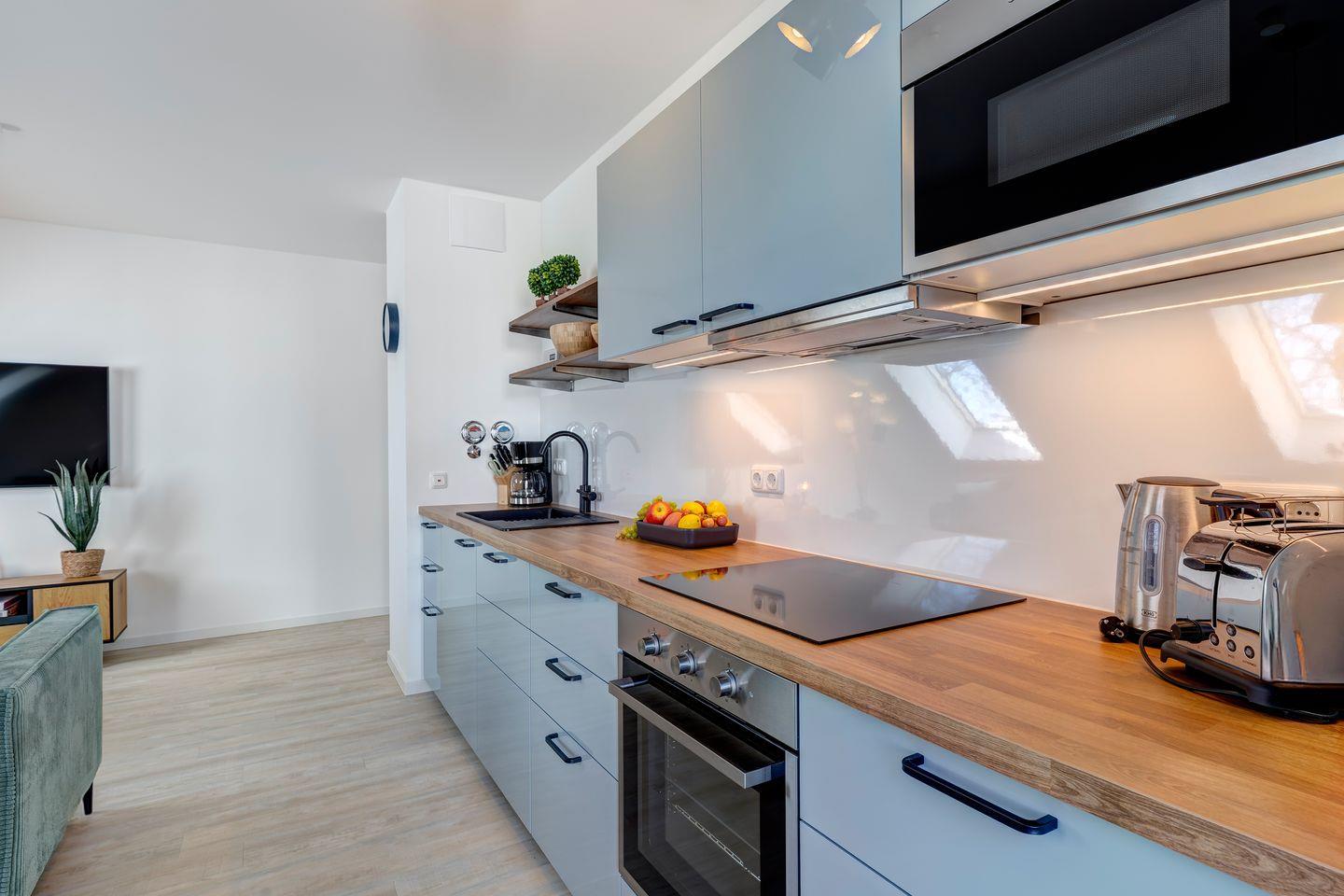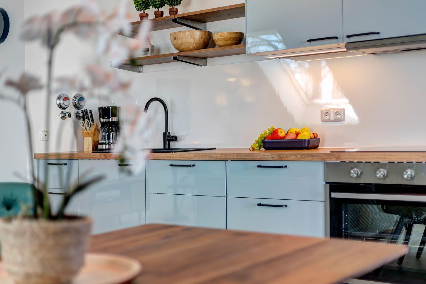 In der geräumigen Wohnung trifft Design auf Geborgenheit. Ruhen Sie sich aus in Betten hoher Qualität und Sesseln in beruhigendem Grün, auf dem großen Balkon auf der Lounge-Ecke und einem Esstisch mit Westausrichtung, oder kochen Sie gemütlich in der voll ausgestatteten Küche. Die Wohnung verfügt über ein Haupt- sowie Gästebad.