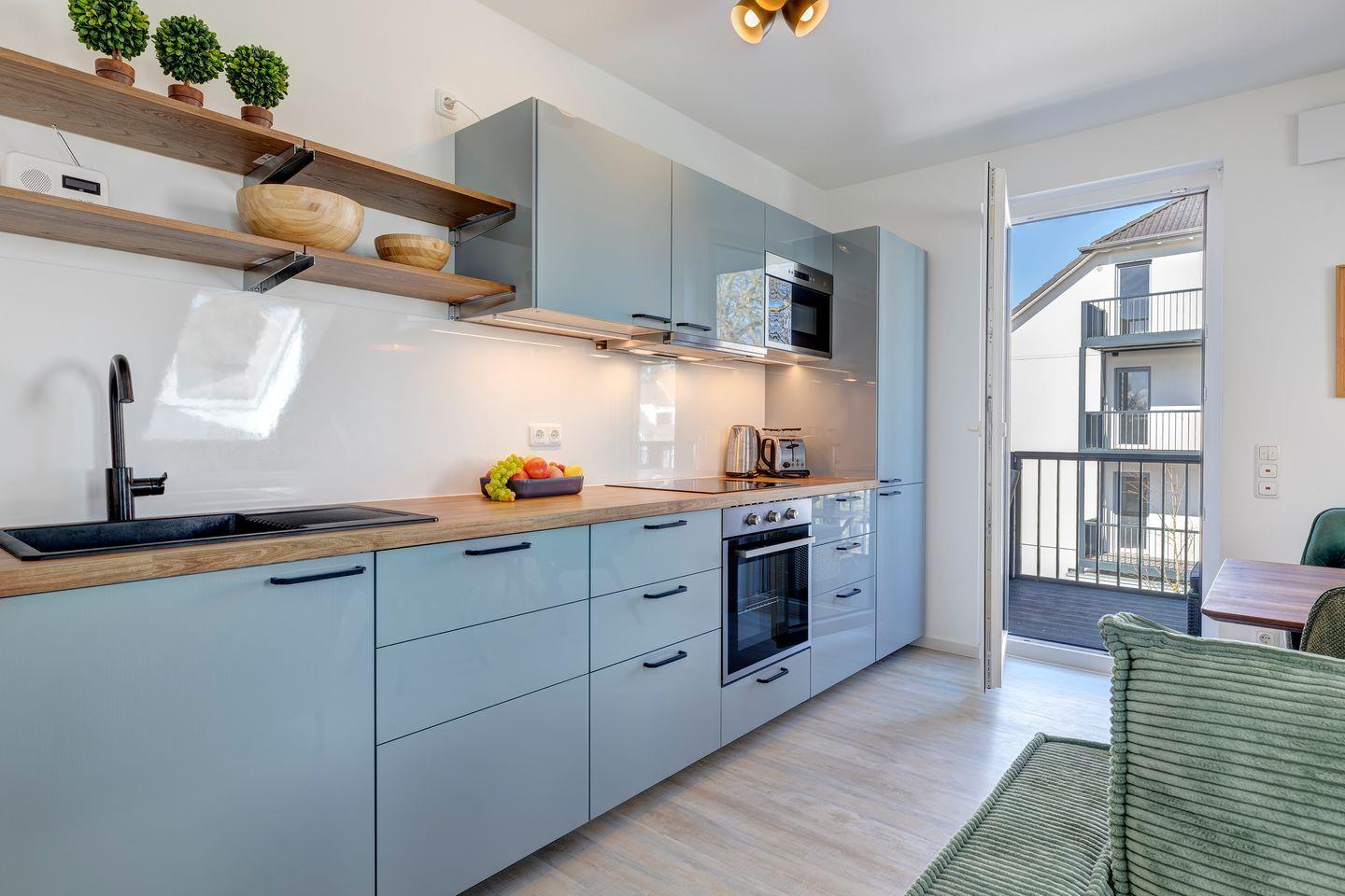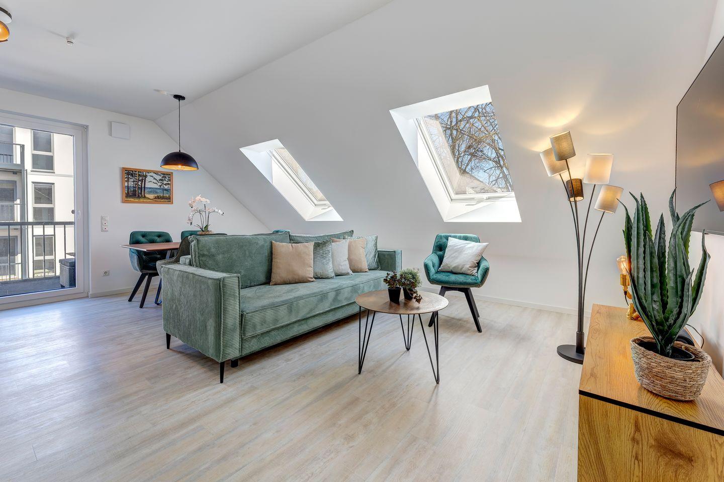 In der geräumigen Wohnung vereinen sich Design und Geborgenheit. Ruhen Sie in hochwertigen Betten, Sesseln in beruhigendem Grün oder genießen Sie den großen Balkon mit Westausrichtung. Die voll ausgestattete Küche lädt zum Kochen ein. Mit einem Schlafzimmer mit Doppelbett und zwei Zimmern mit Einzelbetten eignet sich die Wohnung für Strandurlaube oder Workation, dank schnellem WLAN und Schreibtisch. Zwei weitere Schlafplätze bietet das Schlafsofa in der Wohnküche mit Top-Matratze.