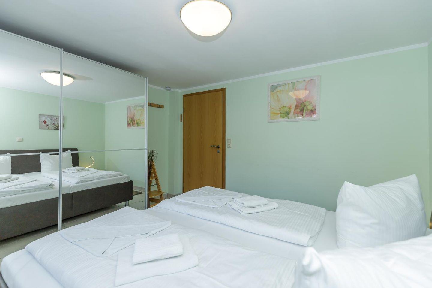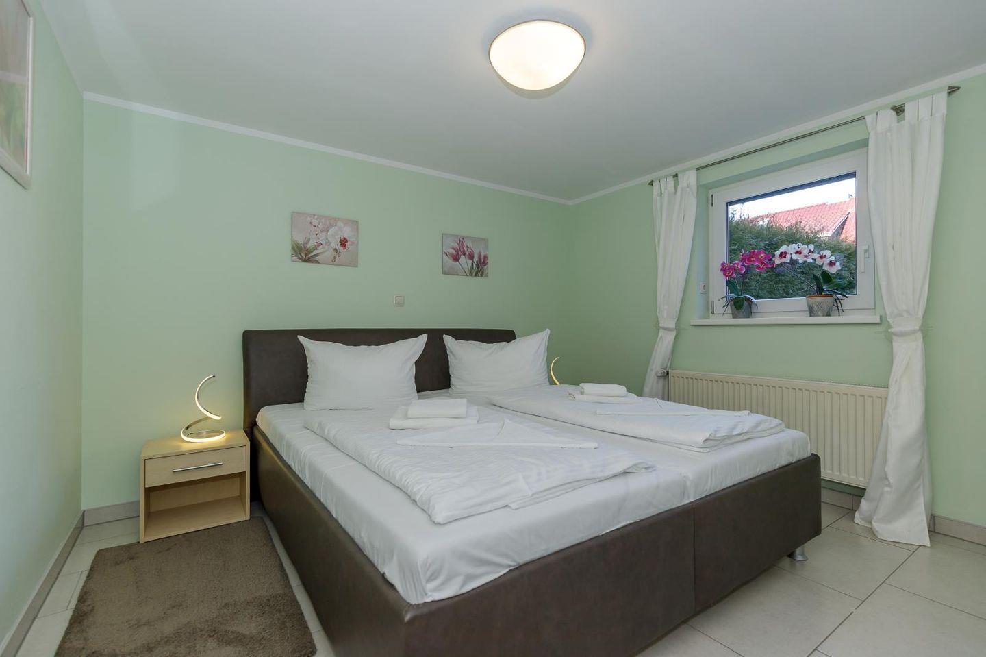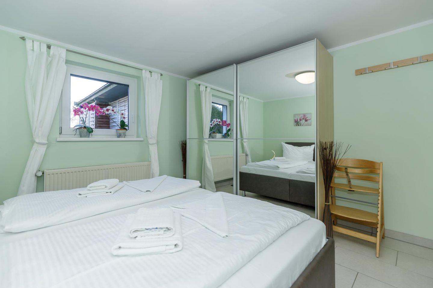 Das behagliche Schlafzimmer bietet ein bequemes Doppelbett und ein geräumigen Schwebetürschrank für Ihre Urlaubsgarderobe.