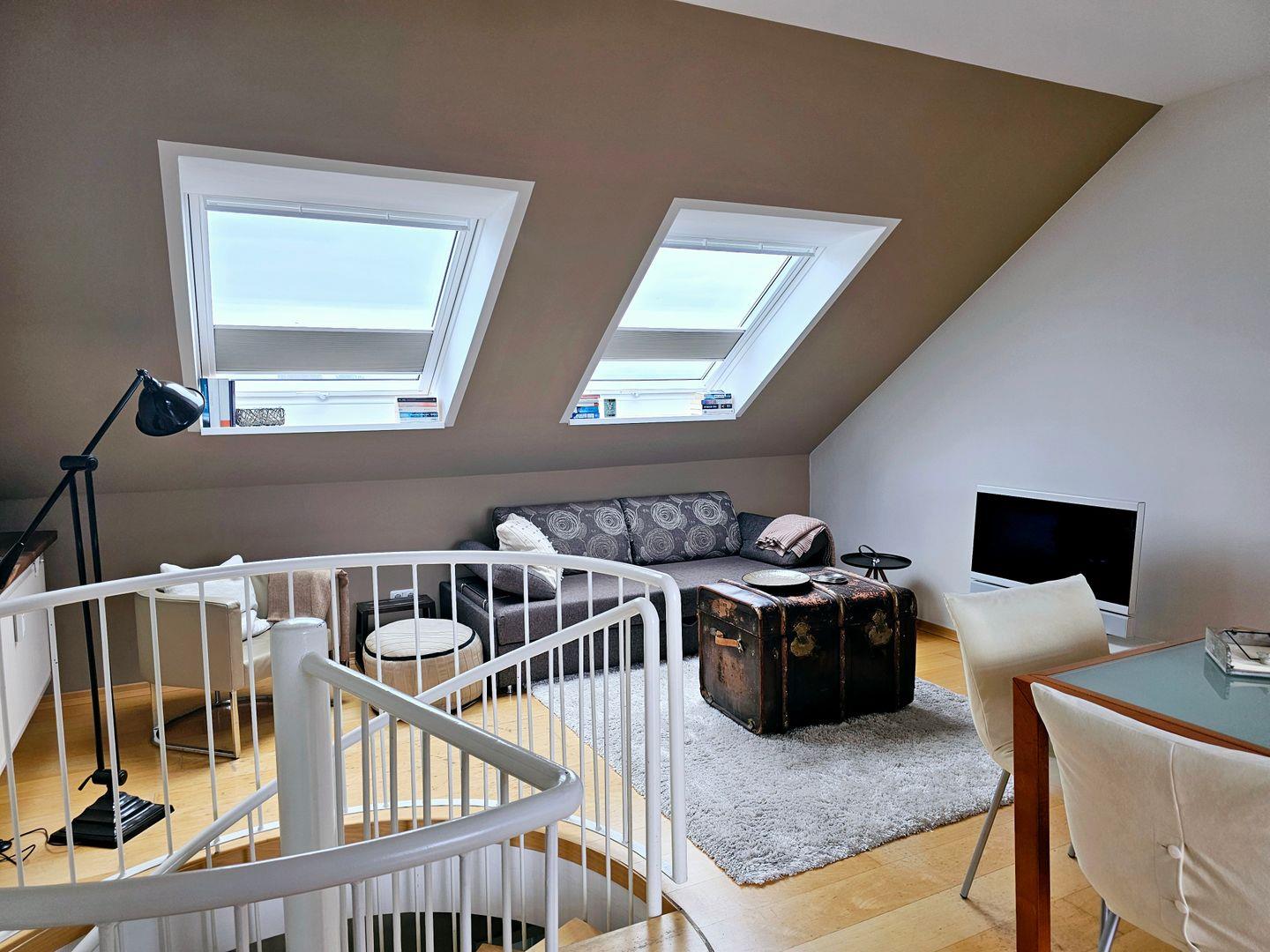 Über eine stilvolle Wendeltreppe gelangen Sie in den großzügigen Wohn- und Essbereich mit moderner Küchenzeile. Die sonnige Dachloggia mit Westausrichtung lädt zu entspannten Abendstunden mit Blick über den Stadtwald und – bei klarer Sicht – bis zum Meer ein.