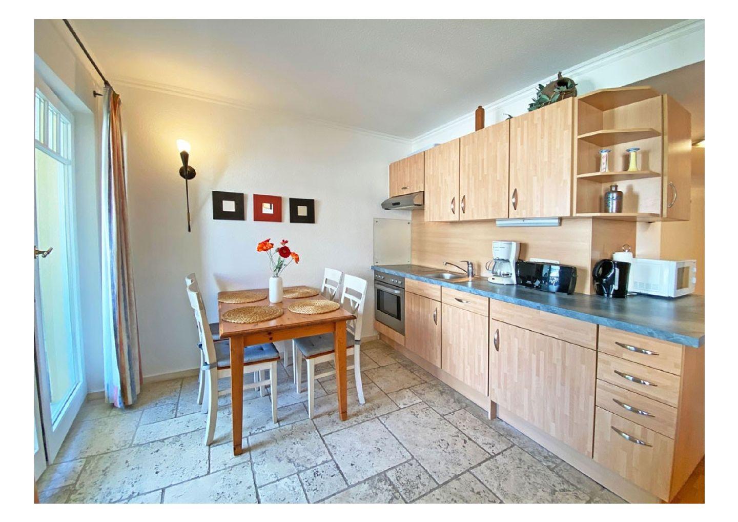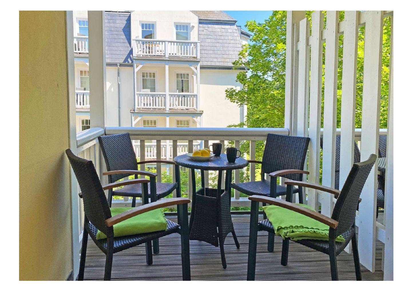 Es besteht aus einem großzügigen Wohn- und Essbereich mit voll ausgestatteter Küche und angrenzendem Balkon. Vom Balkon aus schweift der Blick Richtung Osten – perfekt, um die ersten goldenen Sonnenstrahlen des Tages bei einer Tasse Kaffee zu begrüßen und den Morgen in aller Ruhe zu genießen. Je nach Jahreszeit können Sie vom Balkon aus sogar die schöne Ostsee entdecken.