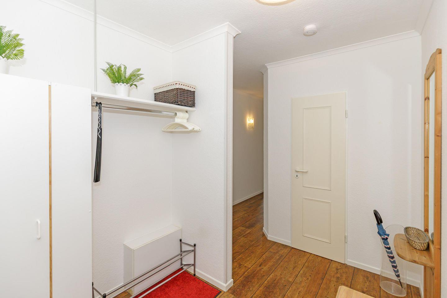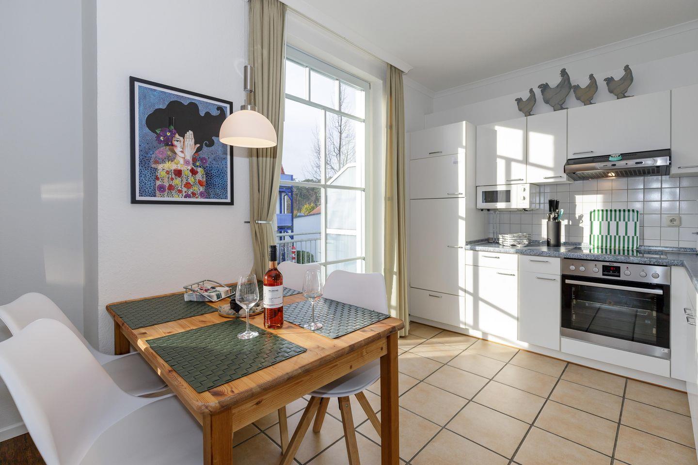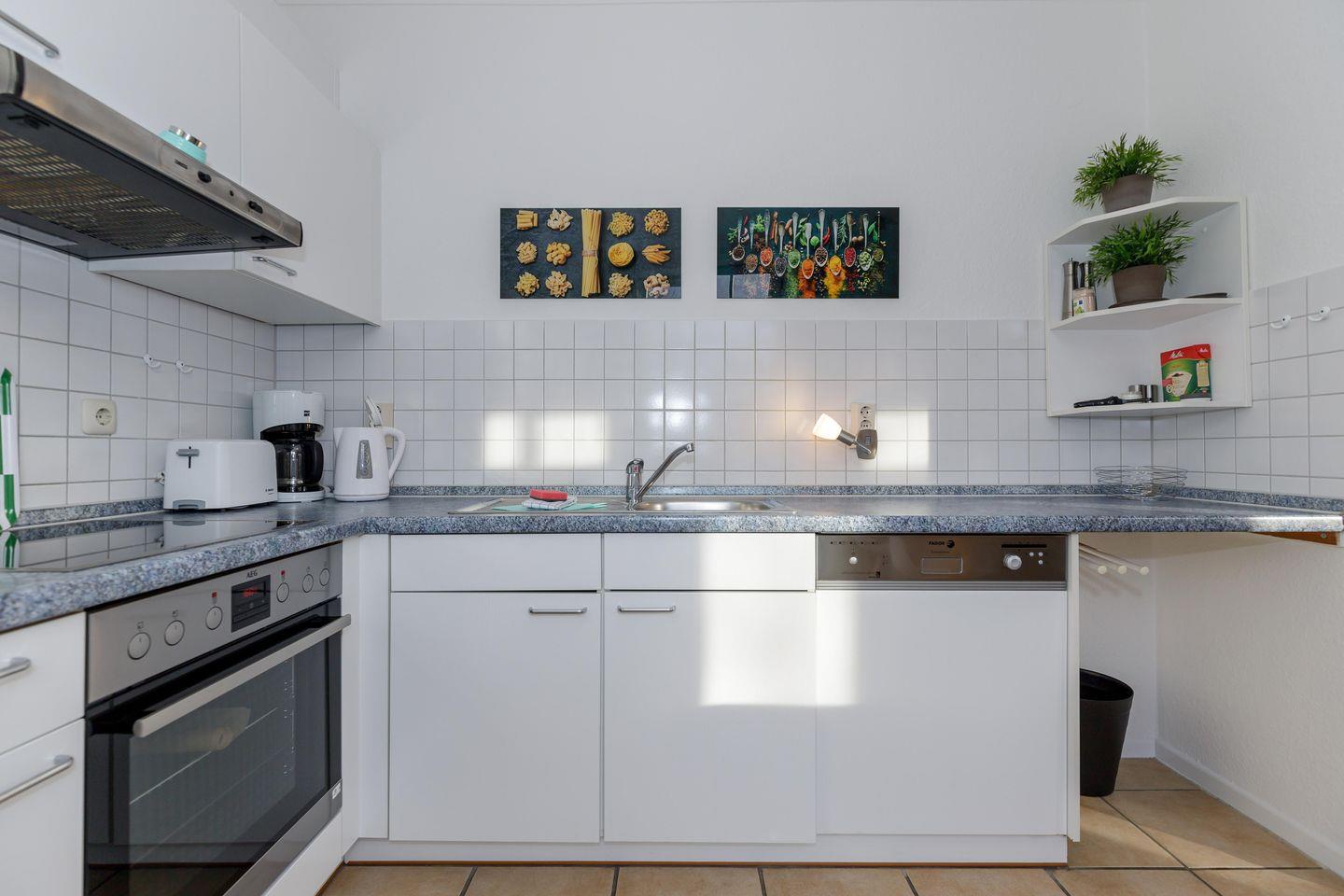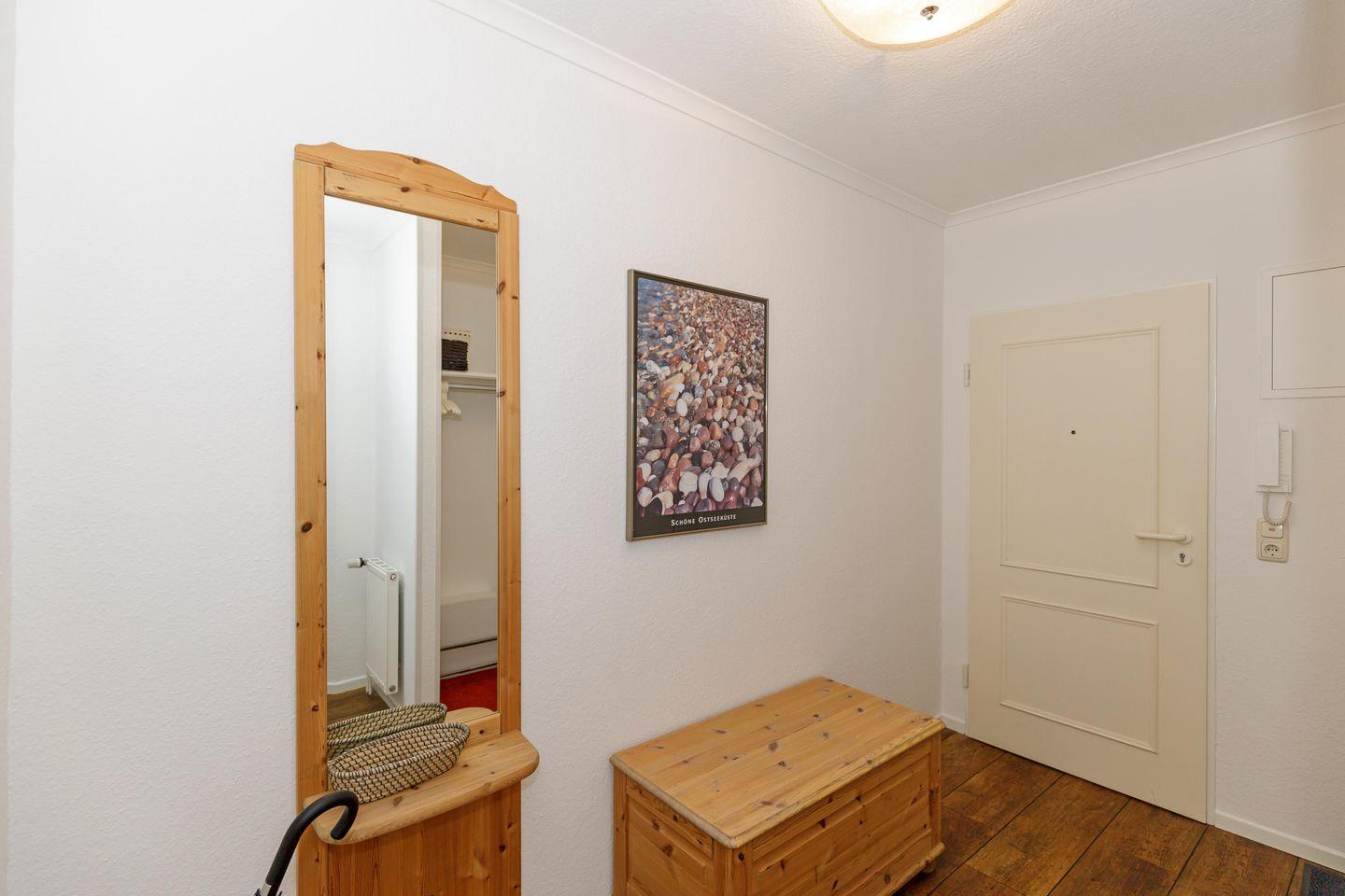 Das geschmackvoll gestaltete Badezimmer mit Dusche wird durch ein zusätzliches Gäste-WC ergänzt. Eine vollständig ausgestattete Küche, WLAN, Kabel-TV und viele liebevolle Details machen diese Wohnung zu einem Rückzugsort für einen rundum gelungenen Ostseeurlaub.