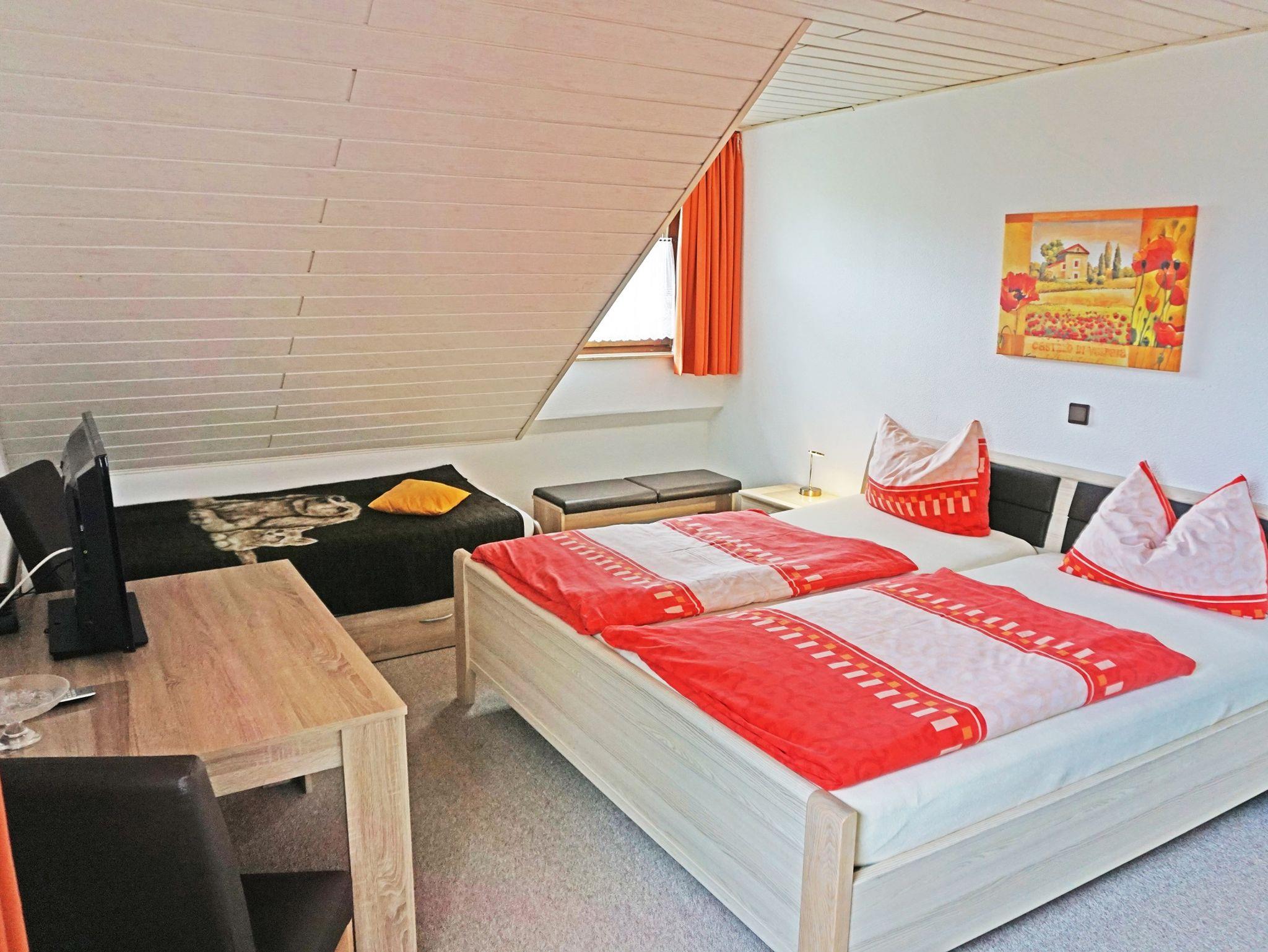 Unsere Zimmer sind ausgestattet mit Dusche, WC, Bettwäsche, Handtüchern, Fön, Radio und Fernsehgerät mit Sat.