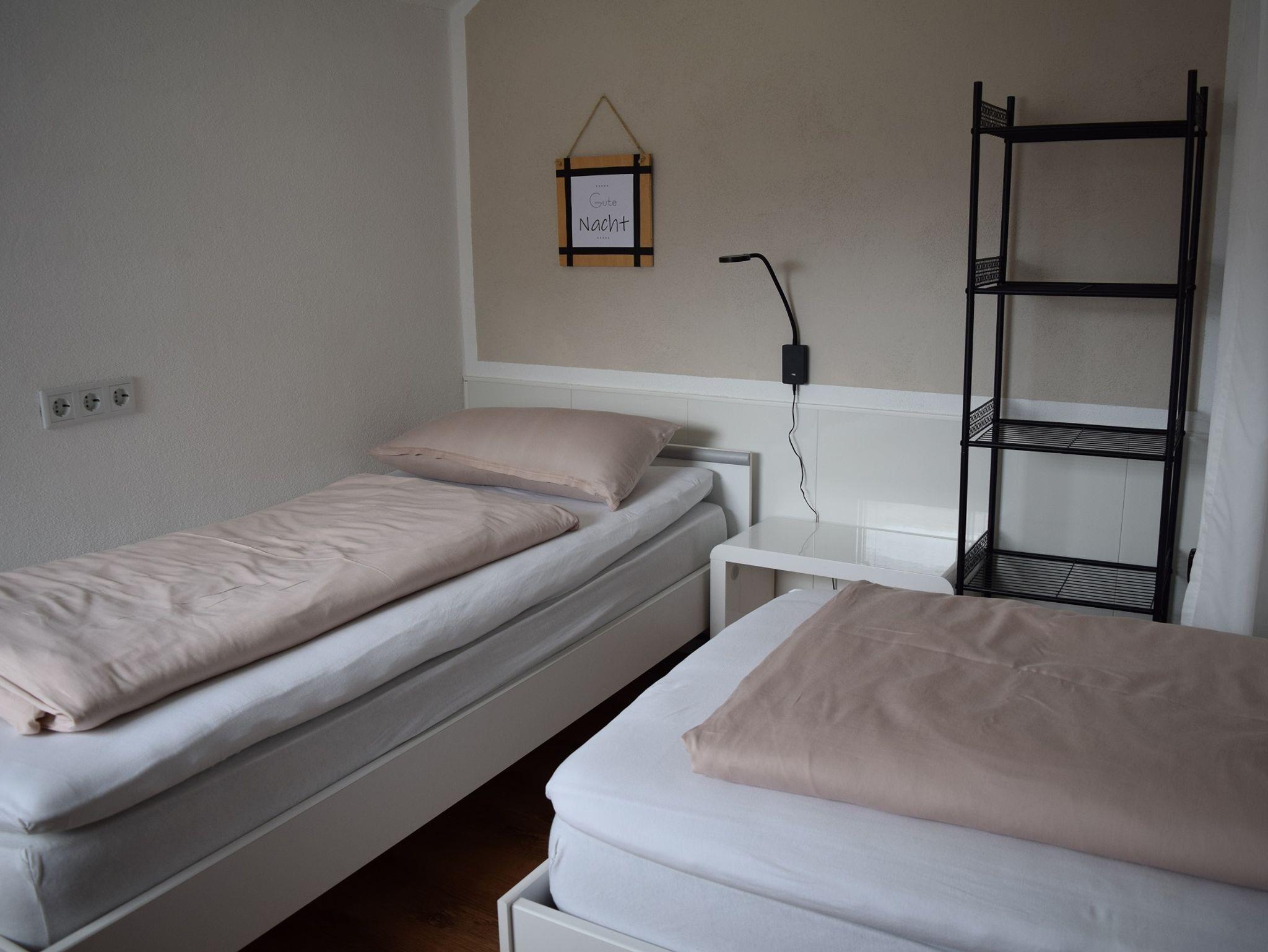 In der lichtdurchfluteten, neu renovierten 100 qm Wohnung befindet sich ein großes Wohnzimmer mit bequemem Sofa und Relaxsessel, Wohnzimmertisch, TV sowie ein kleiner Schreibtisch. Der Blick aus dem Fenster des Schlafzimmers mit Boxspringbett, 180 x 200cm, einer Garderobe, Kleiderschrank und Stuhl, geht auf unseren Lindenbaum. Klein jedoch hell ist das Schlafzimmer mit 2 Einzelbetten, Nachttisch, Kleiderschrank und Garderobe. Die Betten sind bei Ihrer Ankunft bereits bezogen.